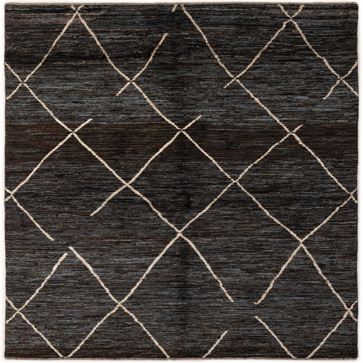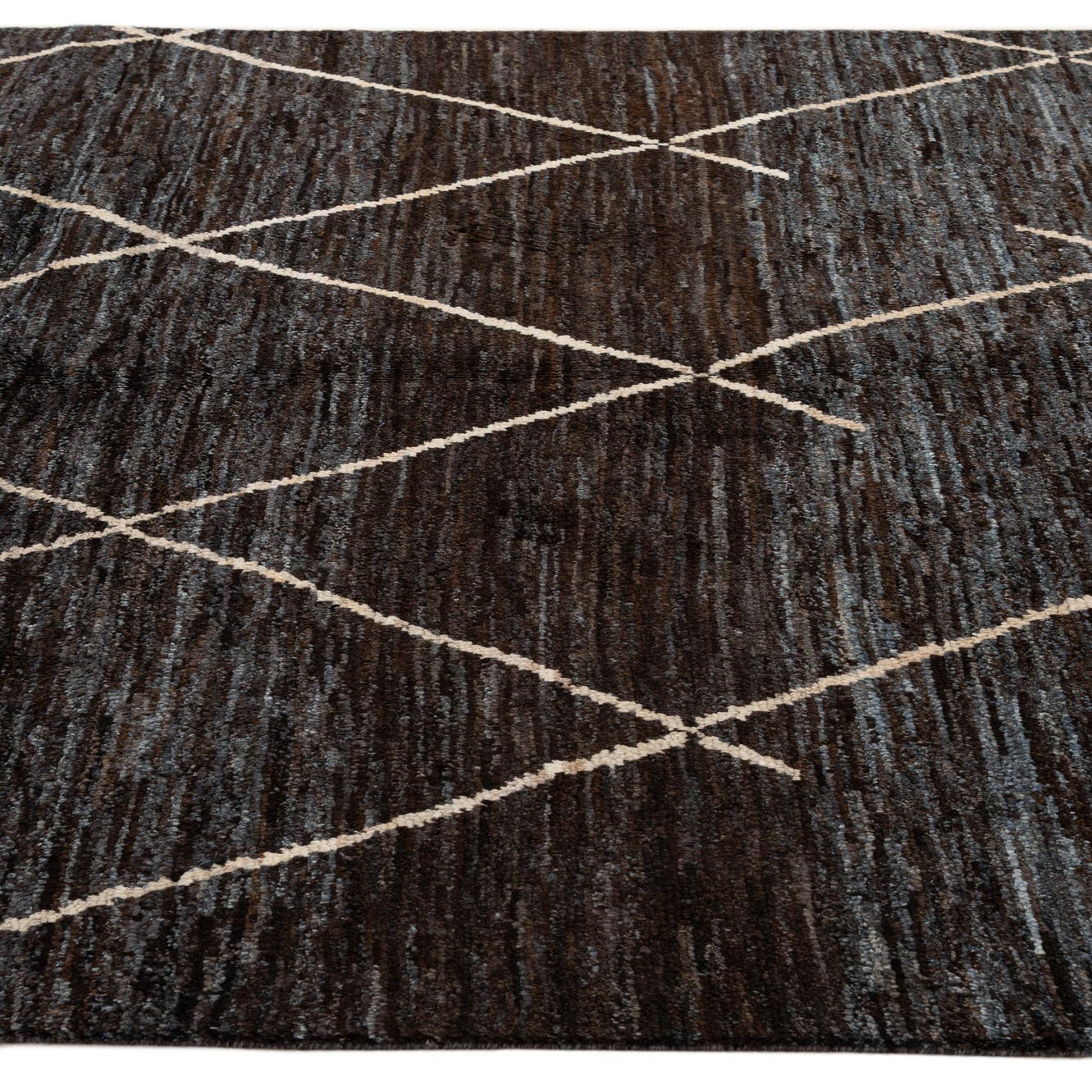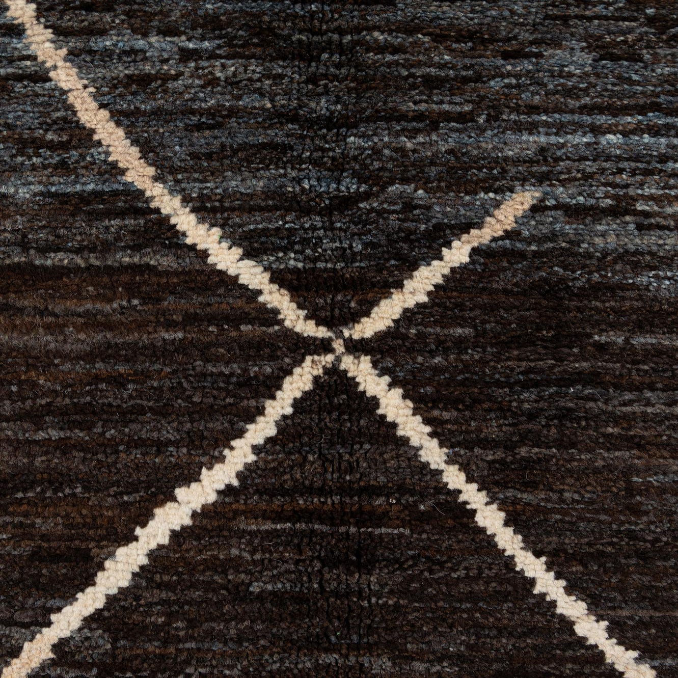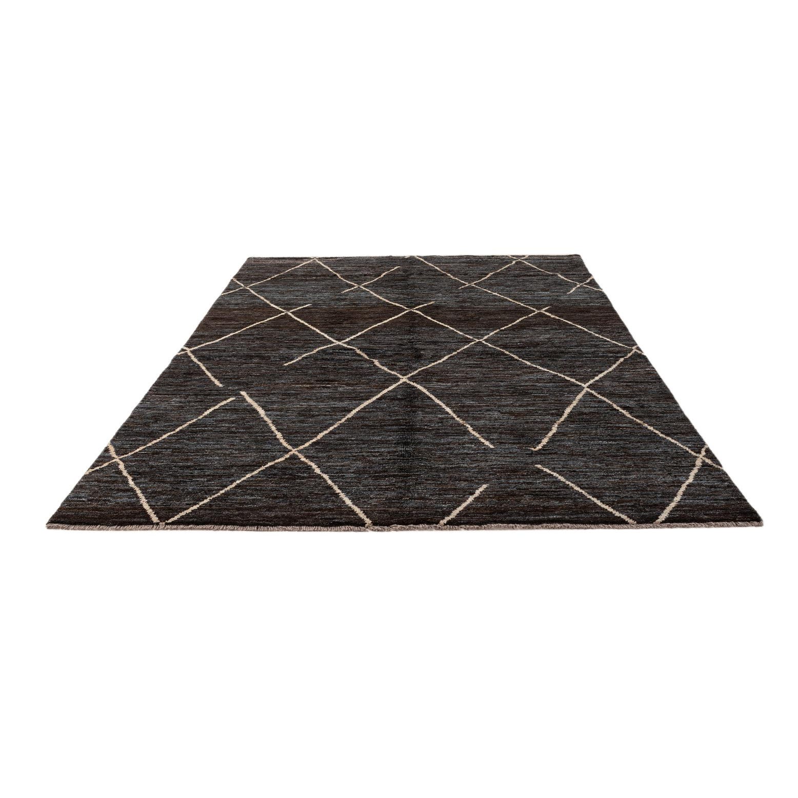 A 6x9 rectangular Moroccan rug in dark brown with a tribal diamond pattern in light tan, ideal for a living room.