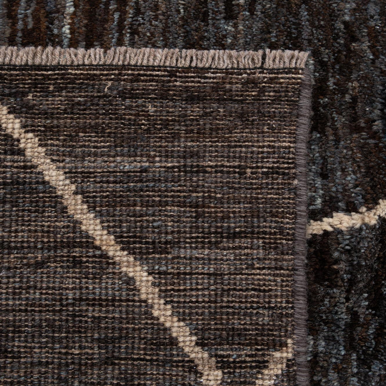 Primary color is Dark Brown. Colors in this rug include: Dark Brown, Blue, Brown, Ivory.