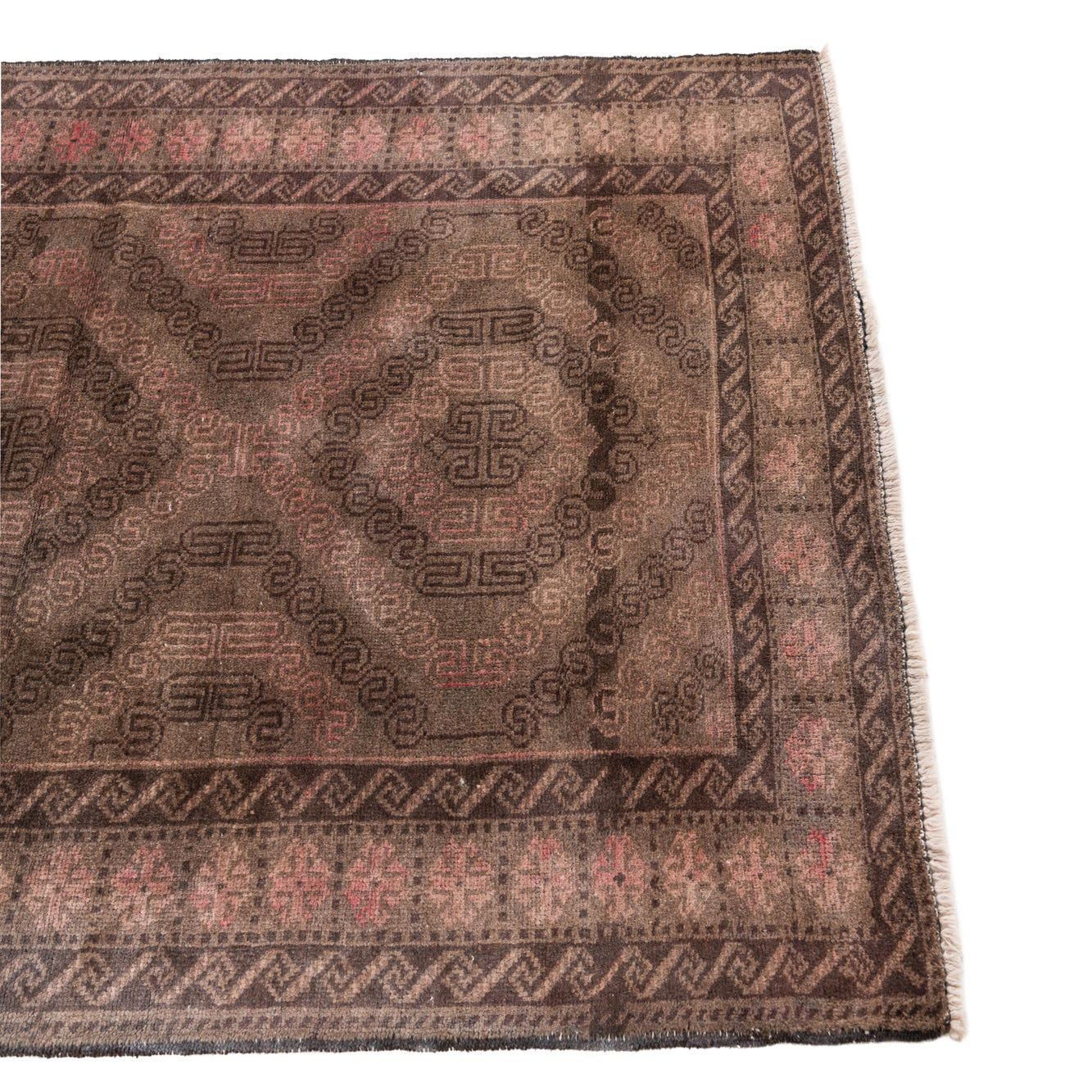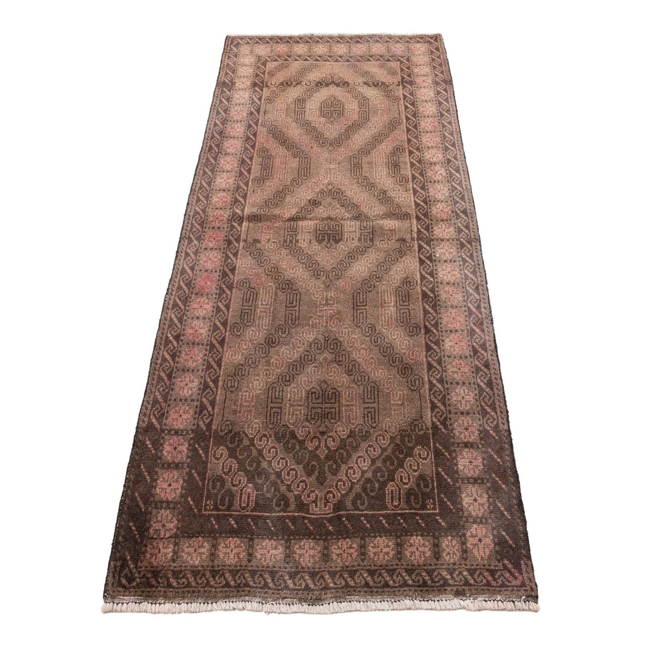A 7 ft runner rug in shades of brown and tan, featuring a distressed Persian-inspired pattern with intricate geometric motifs, ideal for a hallway.