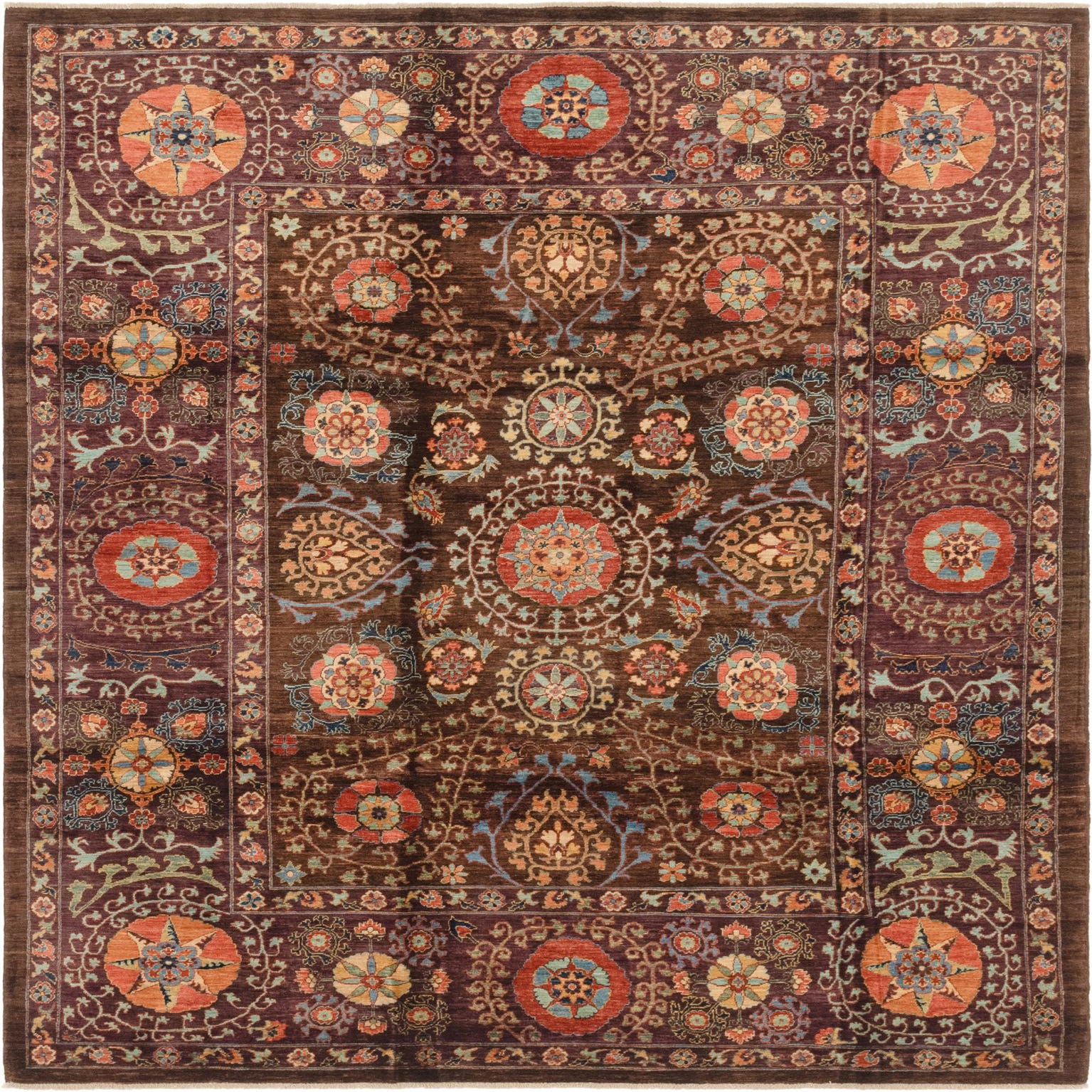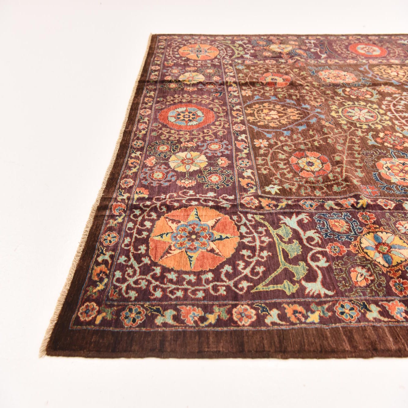 A rich dark brown field anchors an all-over traditional floral design punctuated by circular rosettes and scrolling vinework. Warm tones of orange, red and yellow sit alongside cooler shades of blue, navy and green to create layered contrast across the surface, while a pronounced border frames the composition with repeating medallions and small-scale floral motifs. Hand-knotted from 100% hand-spun wool, the rug has a soft, slightly plush pile with subtle tonal variation and a gentle luster; the hand-spun yarn gives the surface a tactile depth you can feel underfoot and a visible richness to the color transitions.