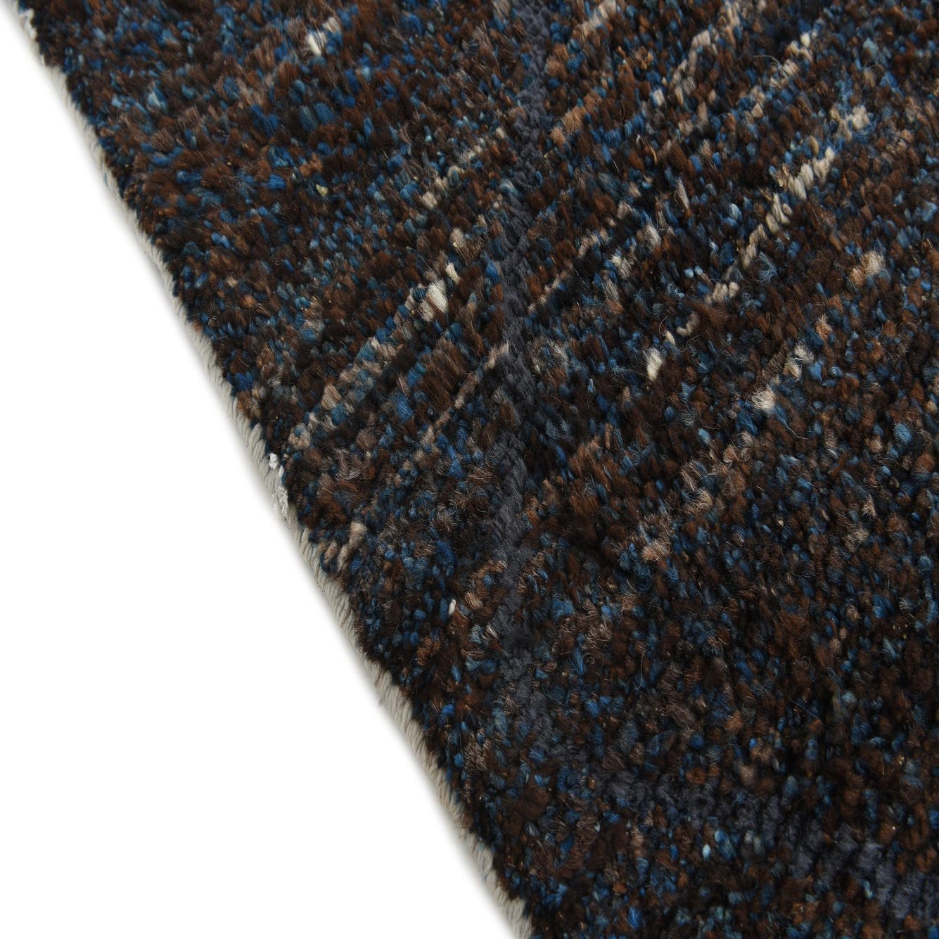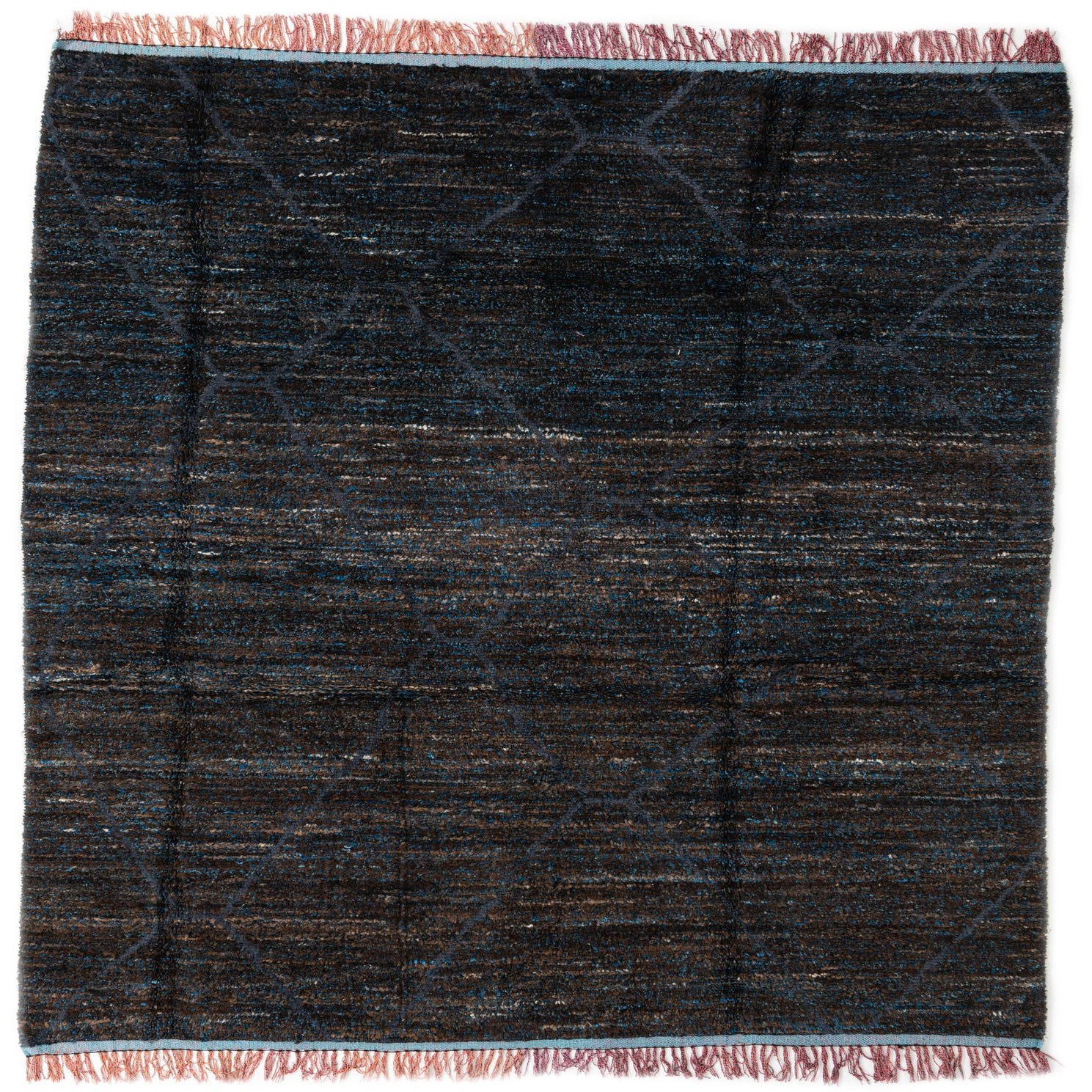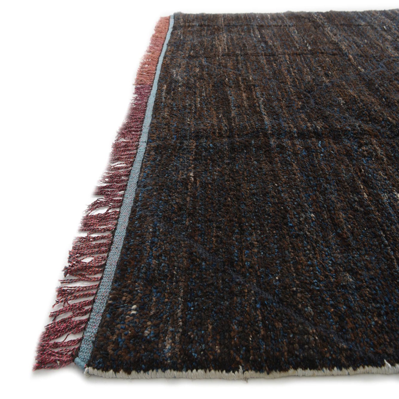 A 7x10 rectangular brown shag rug with subtle blue accents and a tribal geometric pattern, featuring fringe.