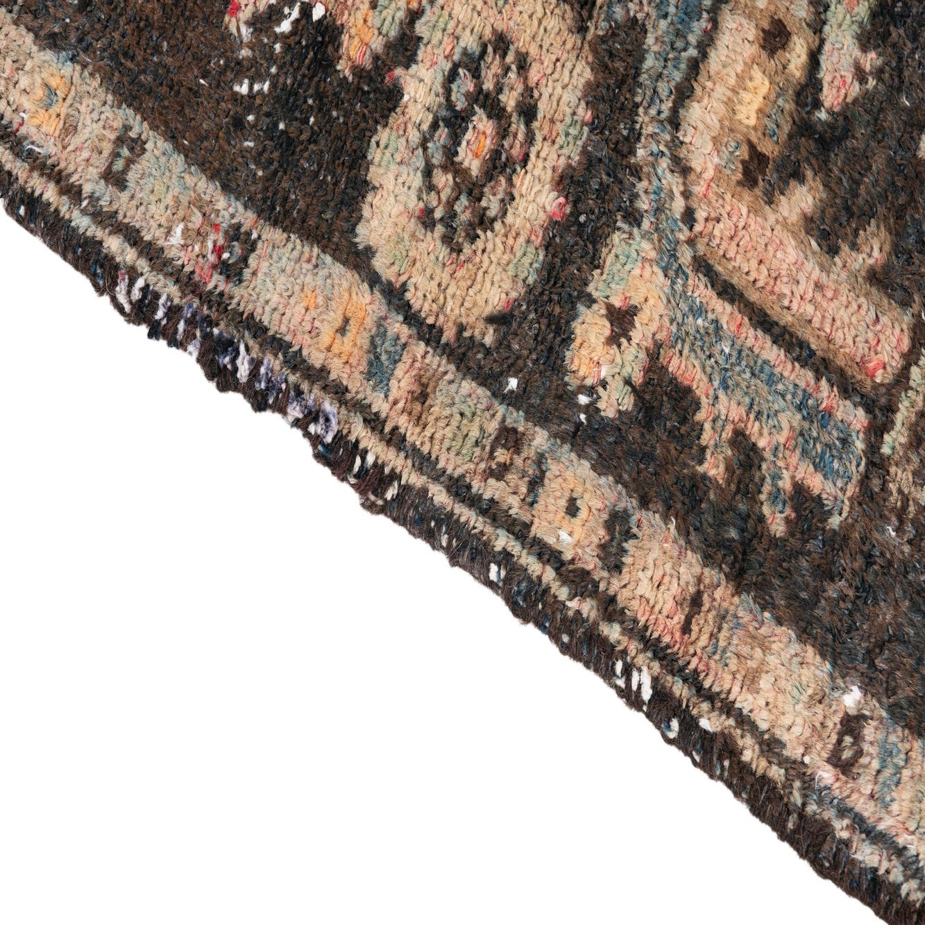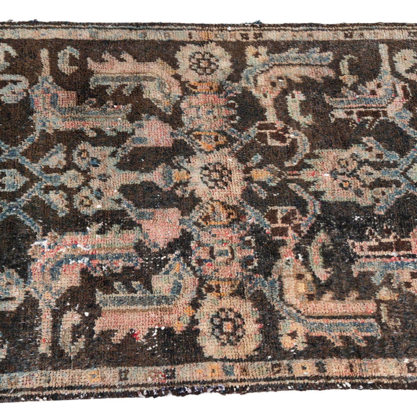 The Ultra Vintage collection proudly offers this hand-knotted 8 Ft Runner, expertly crafted from 100% wool. This piece showcases a complex, ornate pattern that features traditional motifs synonymous with classic design. The color palette is grounded in a dark brown background, complemented by accents of brown, ivory, navy blue, and rust red. The careful interplay of these hues creates a visually harmonious design that is both rich and versatile.