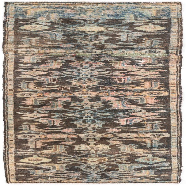 Primary color is Dark Brown. Colors in this rug include: Dark Brown, Brown, Ivory, Navy Blue, Rust Red.