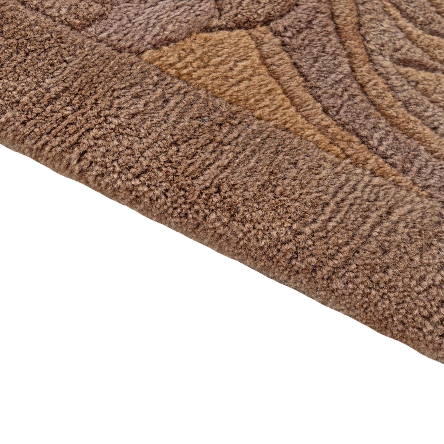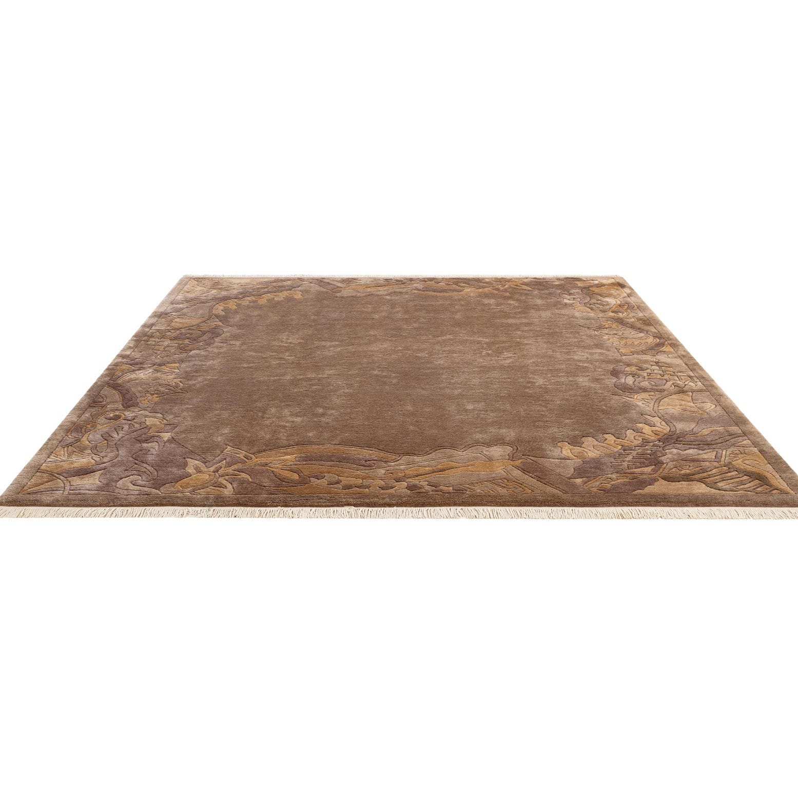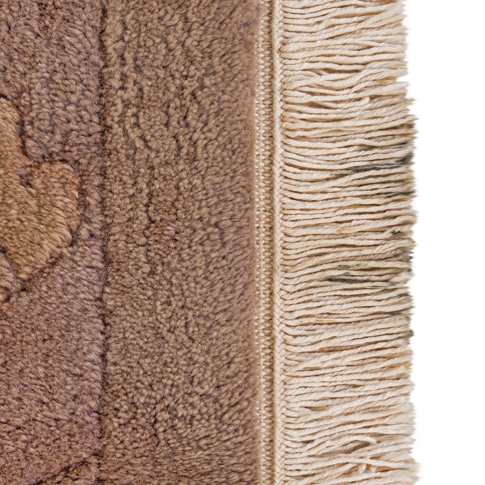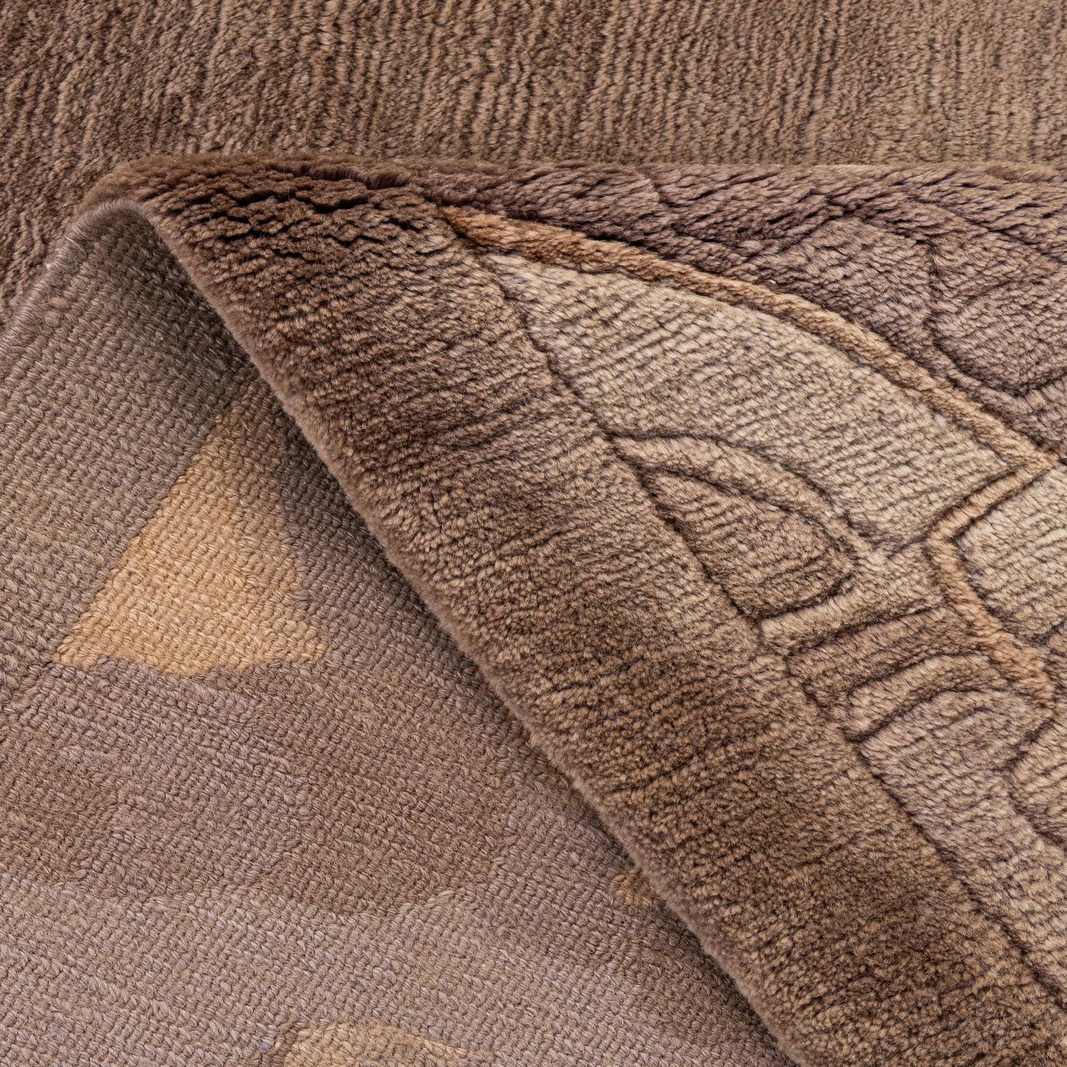 Hand knotted from 100% wool, the rug has a dense, tactile pile that feels soft underfoot and holds a low, natural luster characteristic of wool. It’s well suited to anchor a seating group in a living room with warm wood tones, leather, or mid-century furnishings; to add depth and calm to a bedroom layered with neutral linens; or to ground a study or library with rich textures and brass or matte metal accents. The restrained palette and refined border make it easy to pair with both traditional and contemporary interiors.