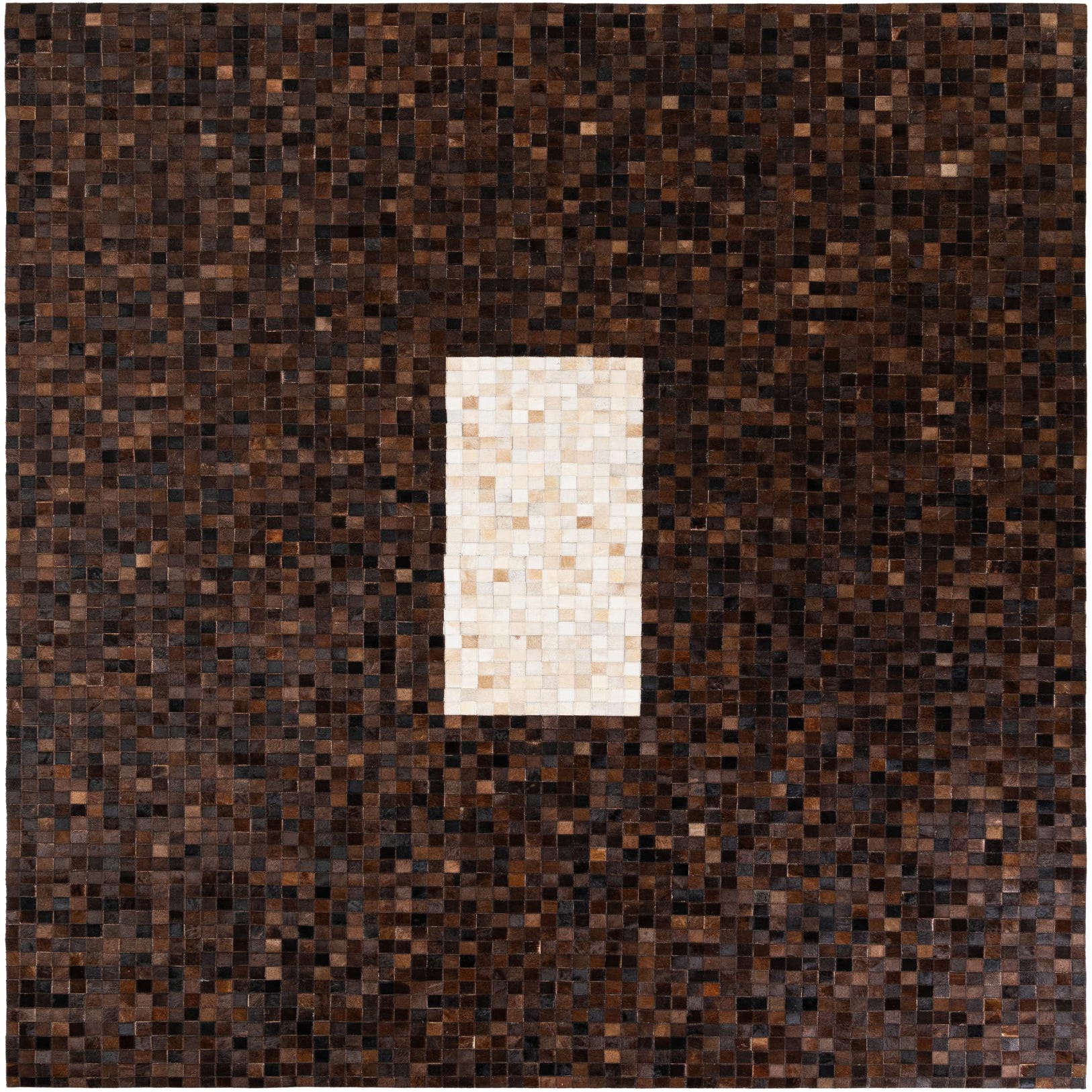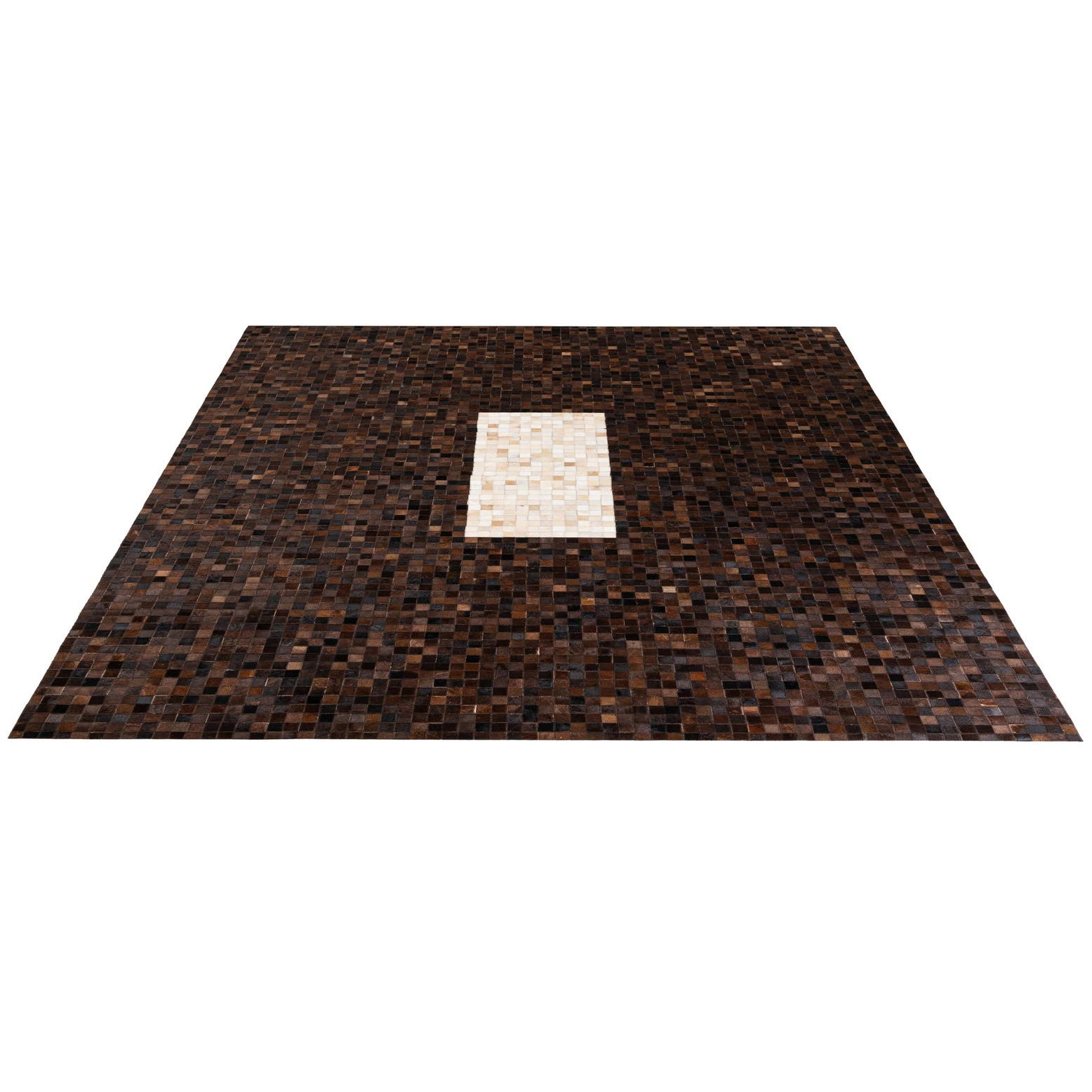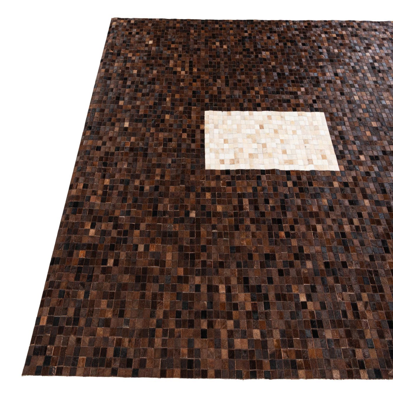 A rectangular 8x10 modern cowhide rug with a mosaic pattern of brown and tan squares, featuring a central white rectangular block.