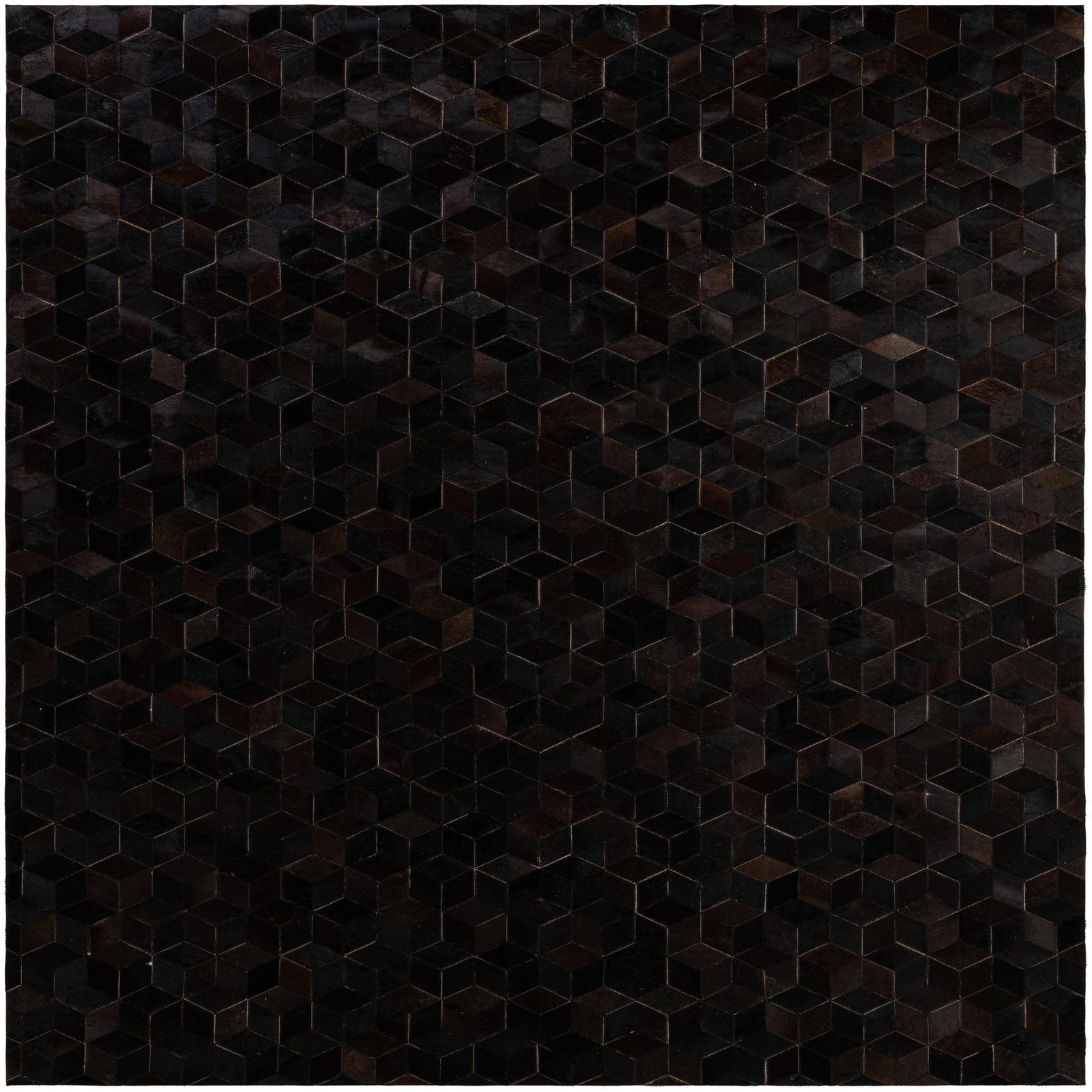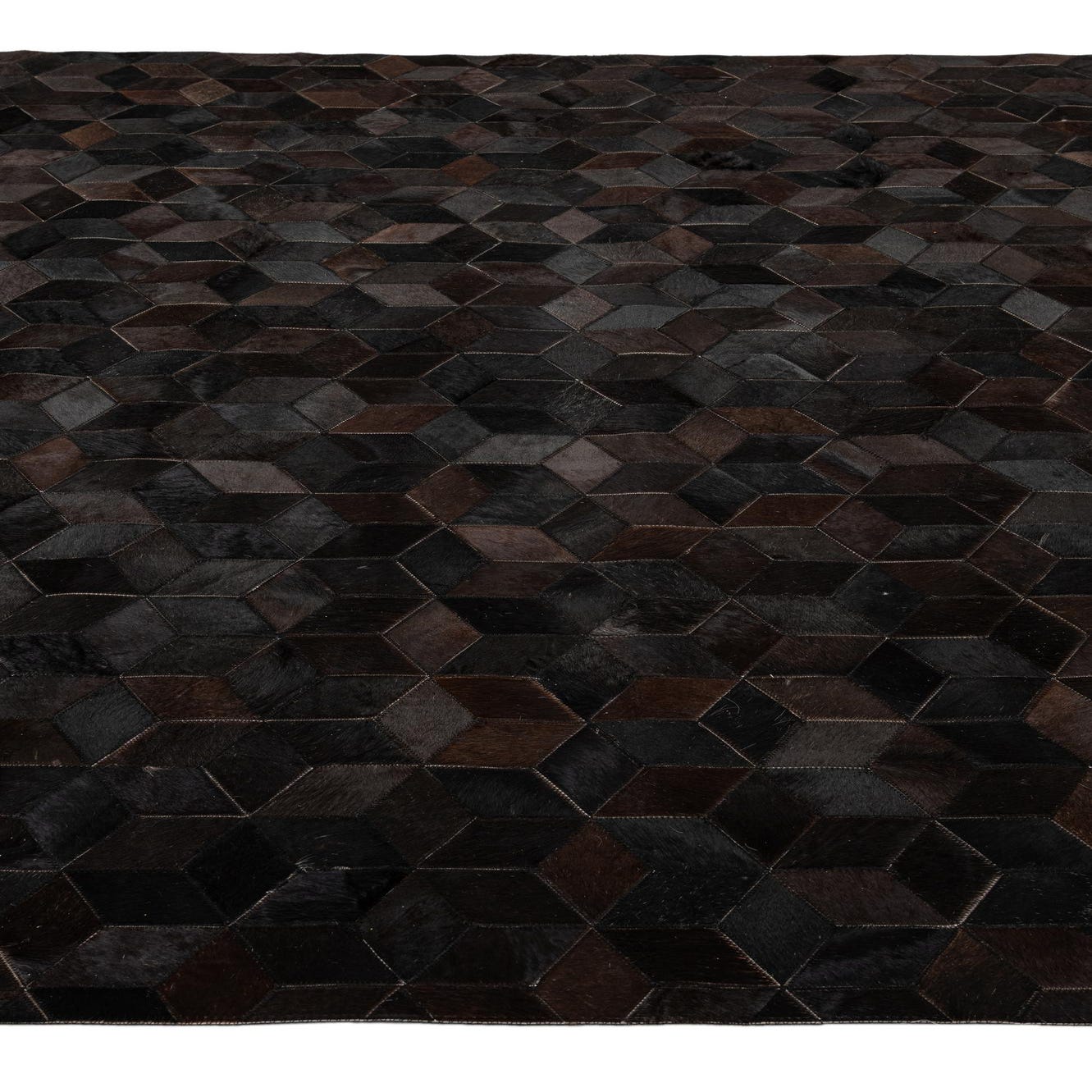 A rectangular 8x10 Cowhide Patchwork rug featuring a modern geometric cube pattern in varying shades of brown and tan.