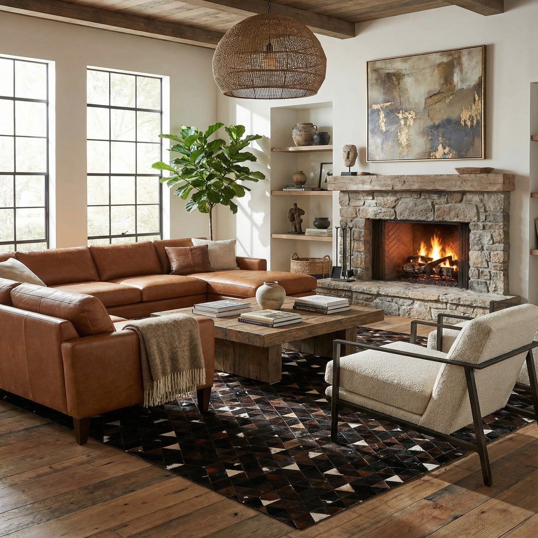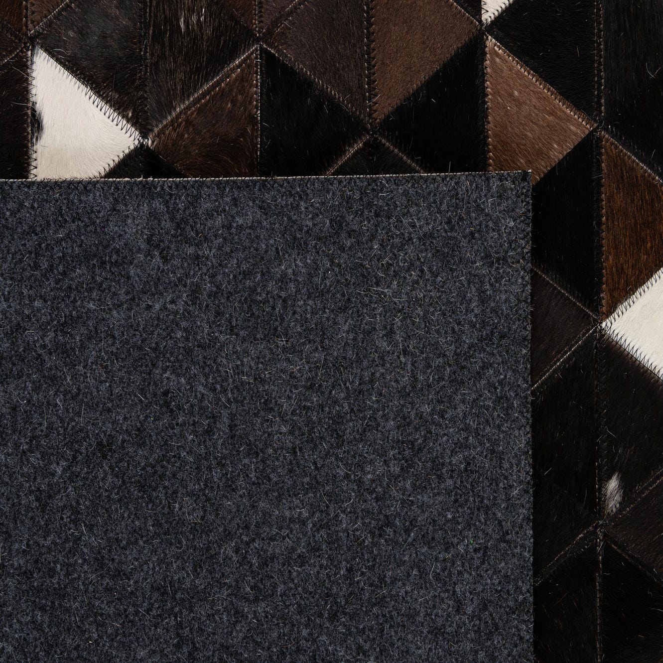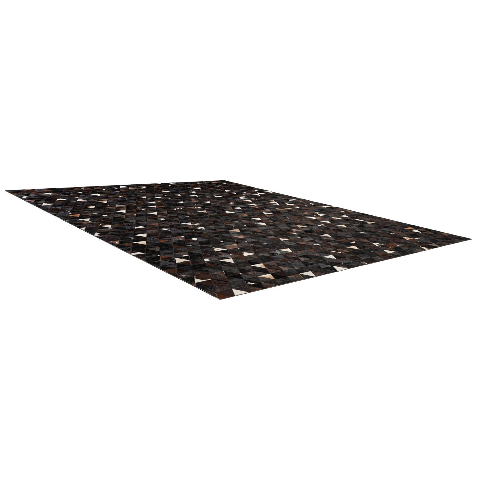 A rectangular 8x10 modern cowhide rug featuring a geometric patchwork of brown, tan, and white triangular pieces.