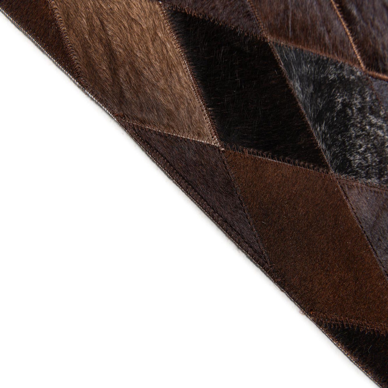 Hand made of cowhide & leather, this rug presents a tight mosaic of diamond-shaped patches laid across a Dark Brown background. The repeating geometric pattern alternates Black and Brown tones that create a layered, dimensional look without heavy pile. The hair-on-hide surface is soft to the touch with a low, tactile nap and a subtle sheen where the leather catches light; the stitched seams add gentle texture and a handcrafted character.
