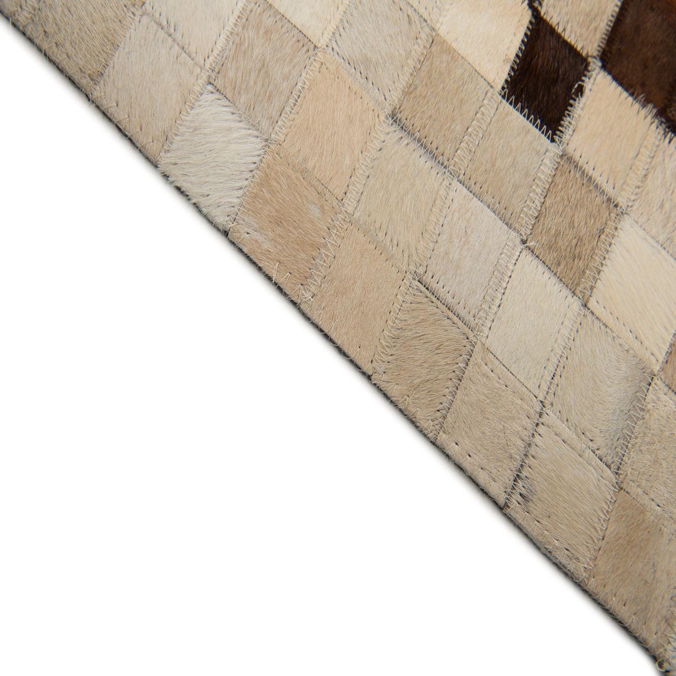 A rectangular 8x10 modern cowhide rug with a dark brown mosaic center and a light tan and brown checkered border.
