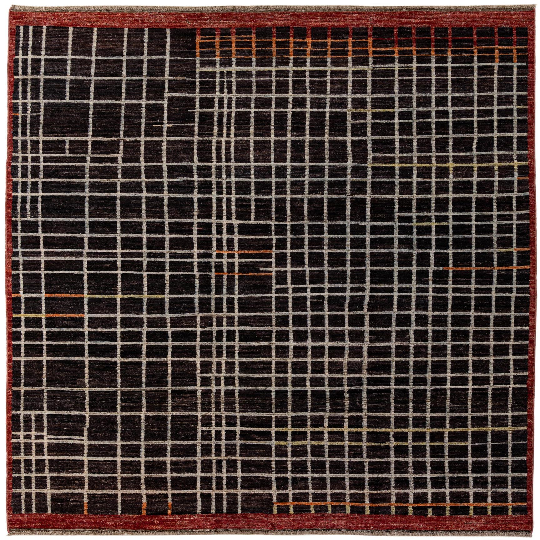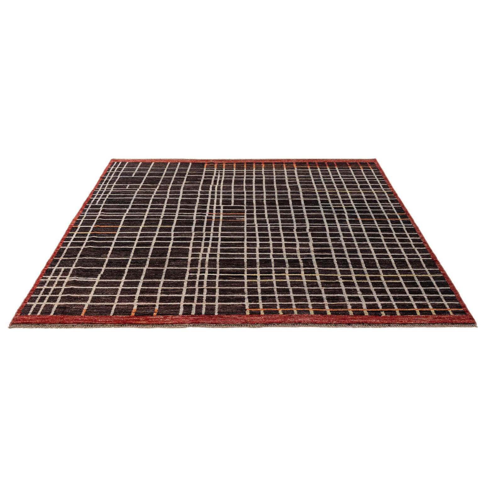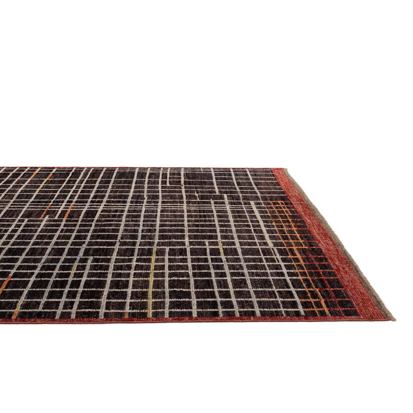 A dark-brown ground is layered with an irregular grid of gray lines that cross and reorder across the field, creating a modern, architectural rhythm. Thin accents of light blue, red and yellow appear like hand-placed strokes, and a narrow red band along the edges frames the composition. The surface has the tactile depth of hand-knotted wool — you can feel the subtle variations in pile where the knots give the rug a slightly ribbed, substantial touch.