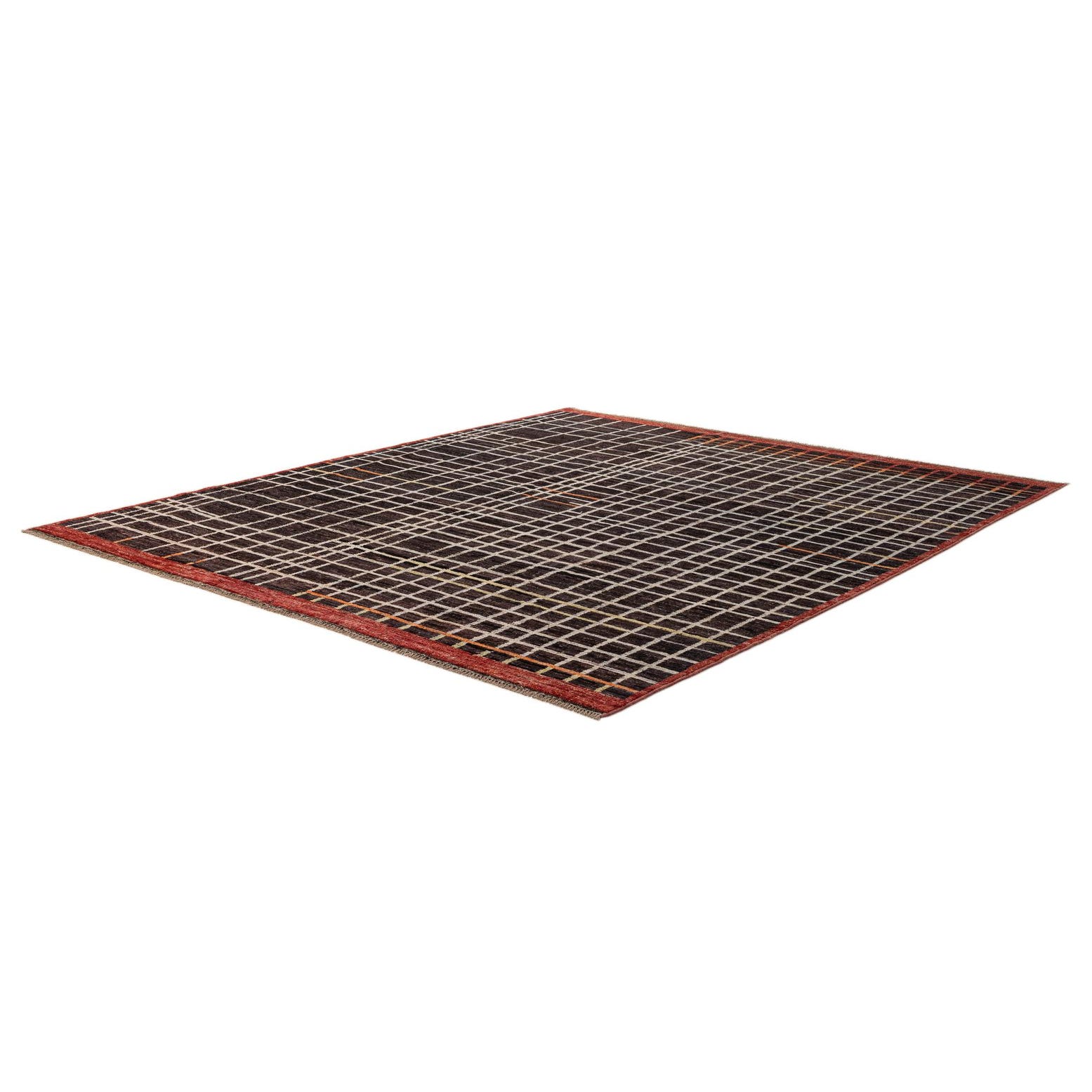 Hand-knotted in 100% wool, this piece brings both texture and visual structure to a room. It anchors a clean-lined living area beneath a sofa and coffee table, works under a dining table to introduce pattern without busying the setting, and complements an office or loft where geometric detail and warm tones are desired. Pair it with warm wood finishes, leather seating, or muted linens for a composed, contemporary look.