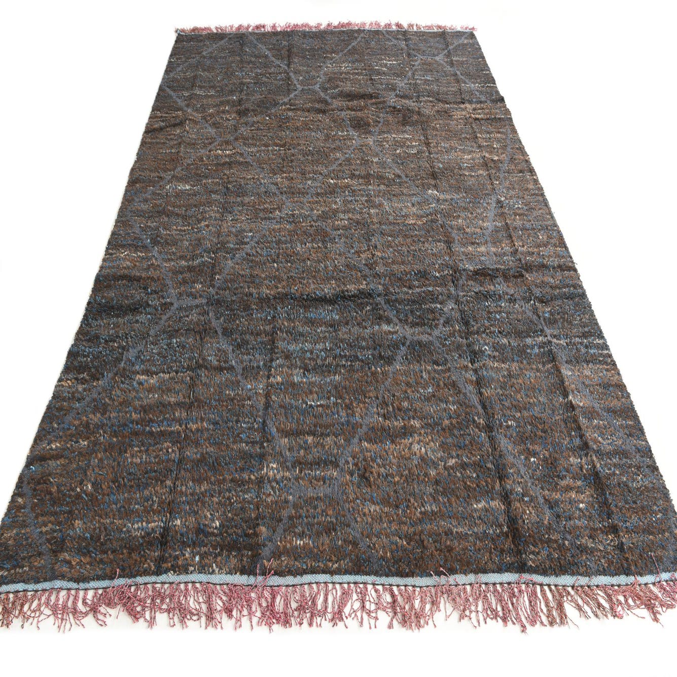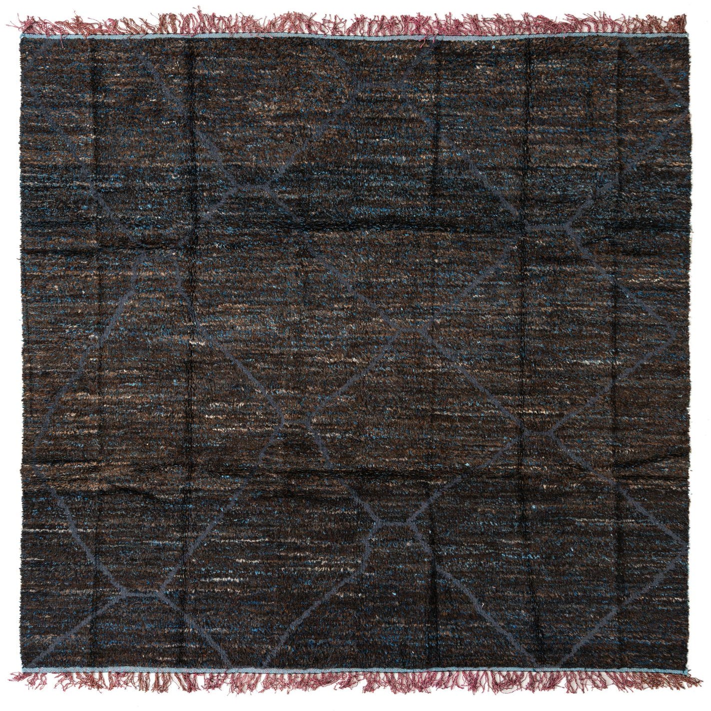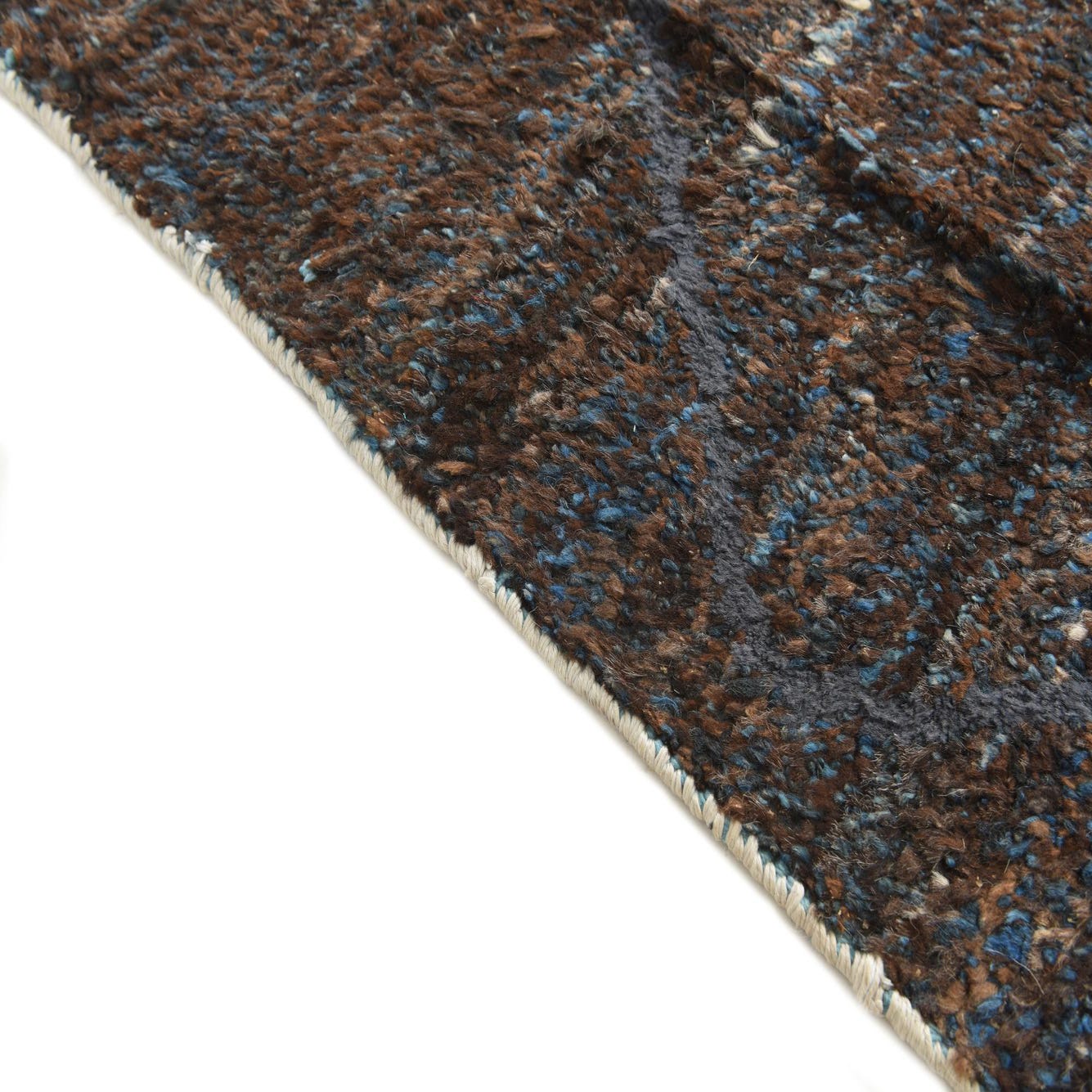 This Moroccan collection rug presents a sophisticated palette of dark brown, blue, gray, ivory, and light brown, creating an effortlessly harmonious visual landscape. The background color of dark brown grounds the piece, lending it a rich depth, while geometric patterns add a visual intrigue to the overall design. The texture is invitingly tactile, thanks to the hand-knotted construction of 100% wool, which imparts both durability and comfort underfoot.