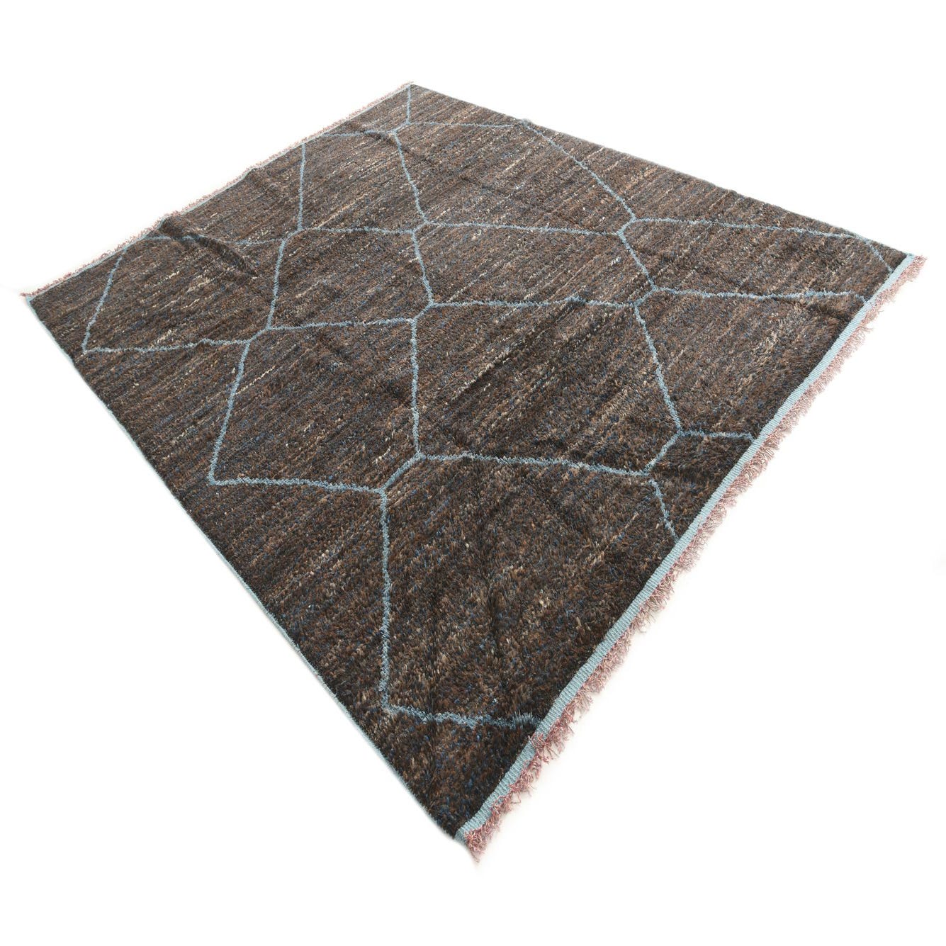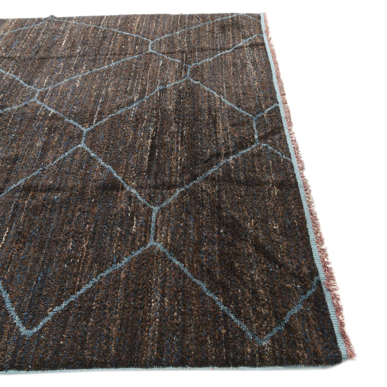 Hand-knotted 100% wool construction forms a dense, tactile surface with natural color variation. The ground is a deep dark brown woven with subtle striations and flecks of ivory and black that add visual depth. A loose geometric lattice of blue lines connects at small nodes to create oversized diamond and hexagon shapes across the field, giving the rug a heritage-inspired, geometric look.