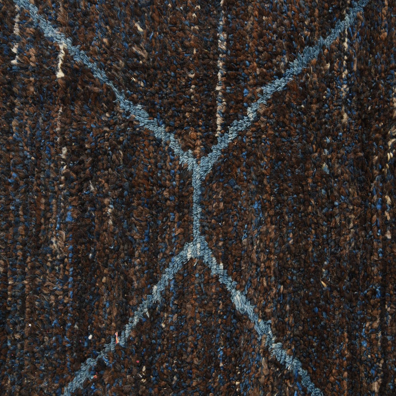 A rectangular 8x10 brown shag rug with a modern tribal diamond pattern in blue, suitable for a living room.