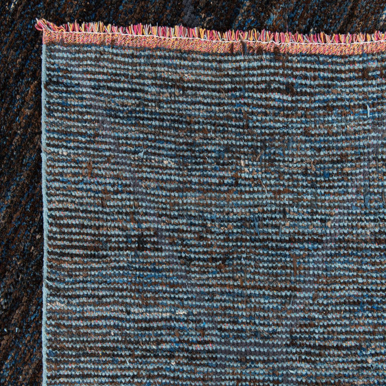 Primary color is Dark Brown. Colors in this rug include: Dark Brown, Blue, Ivory.