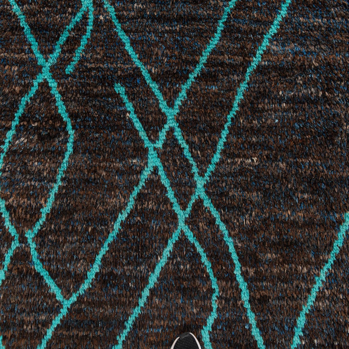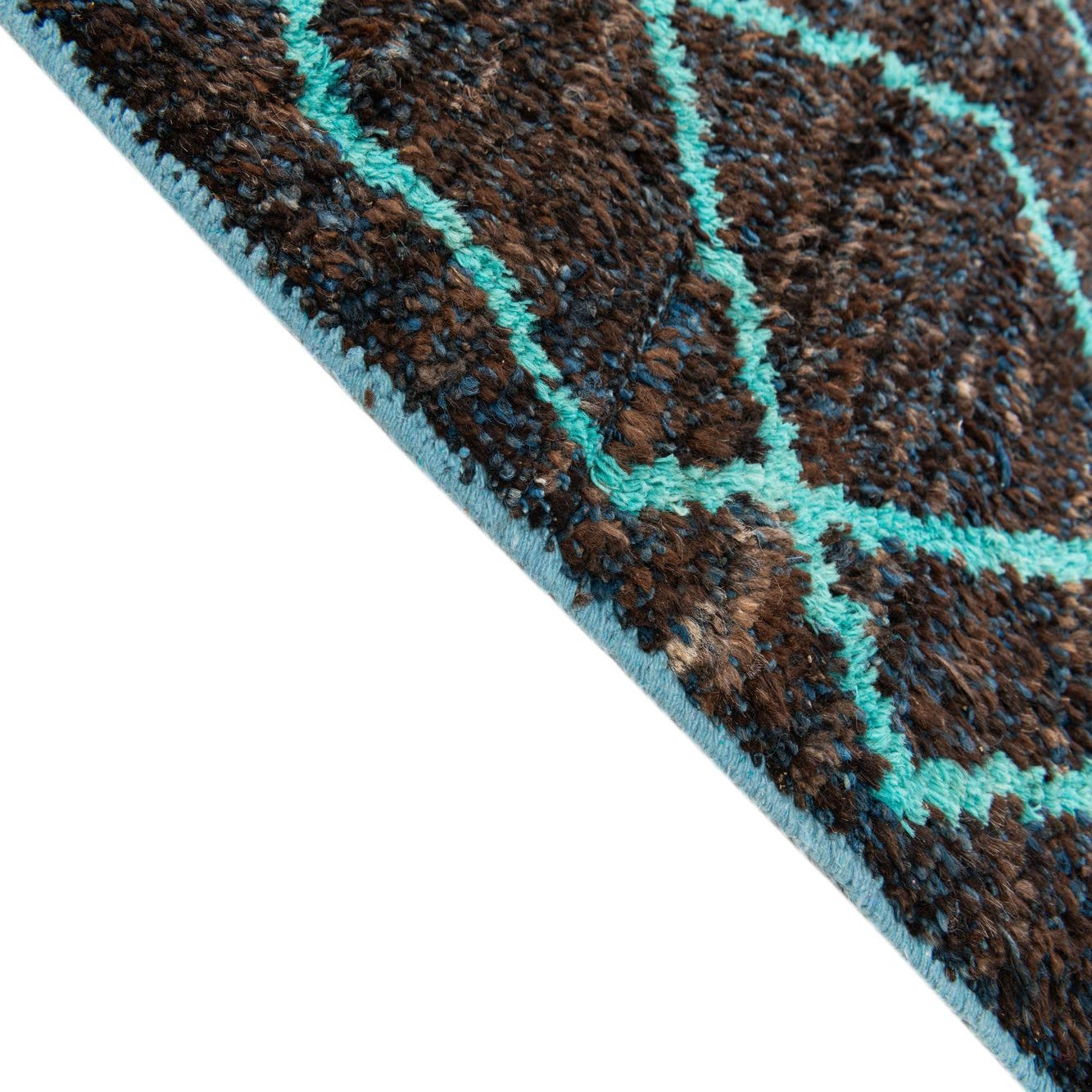 A rectangular 8x10 brown shag rug with a modern tribal pattern of intersecting teal lines, perfect for a living room.