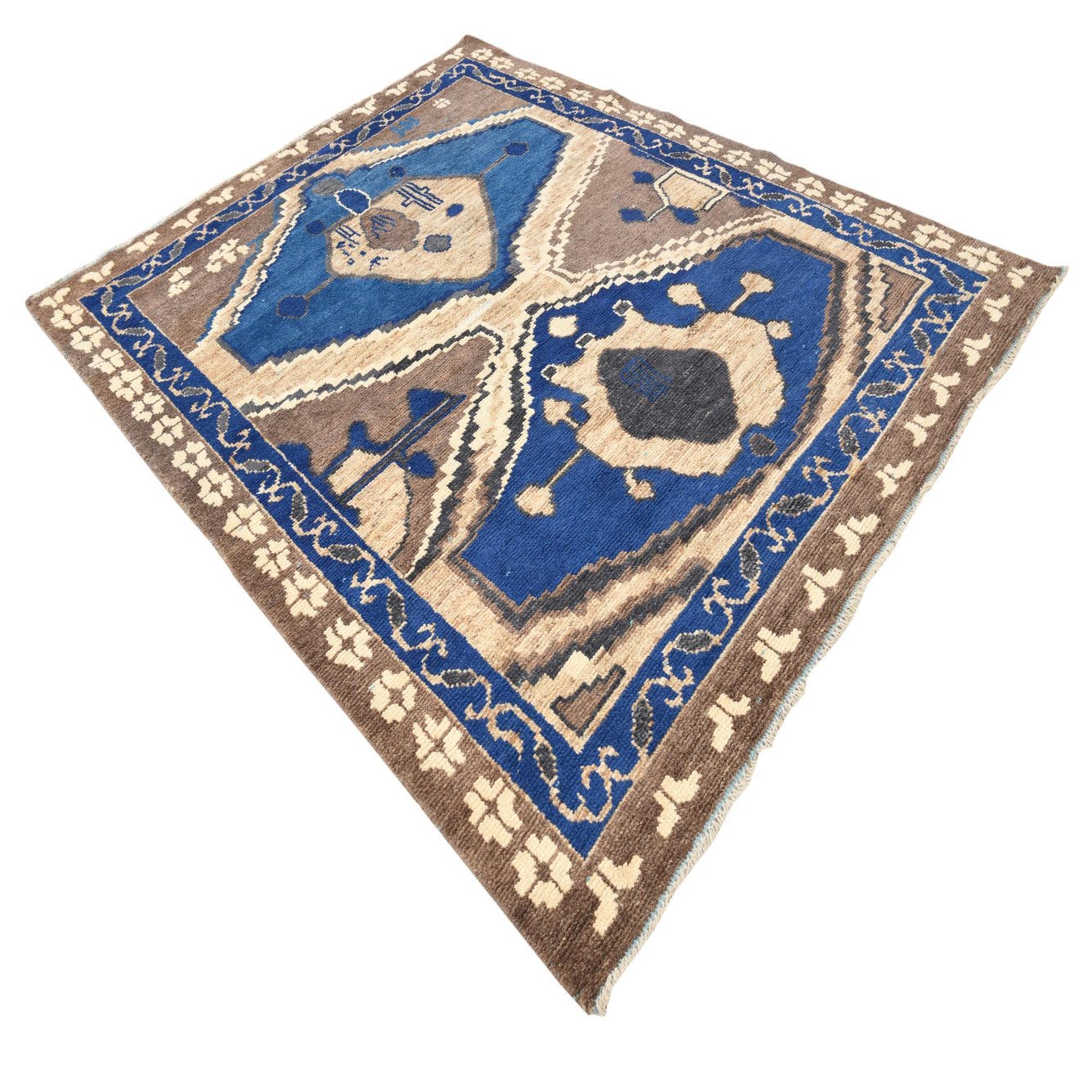 Primary color is Dark Brown. Colors in this rug include: Dark Brown, Blue, Ivory, Light Brown.