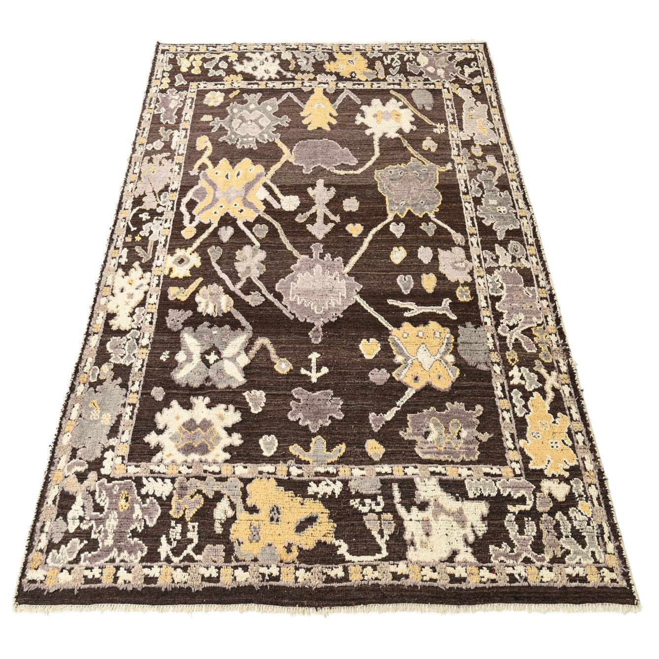 A rectangular 8x10 brown Oushak rug with a modern floral pattern in tan, grey, and yellow, suitable for a living room.