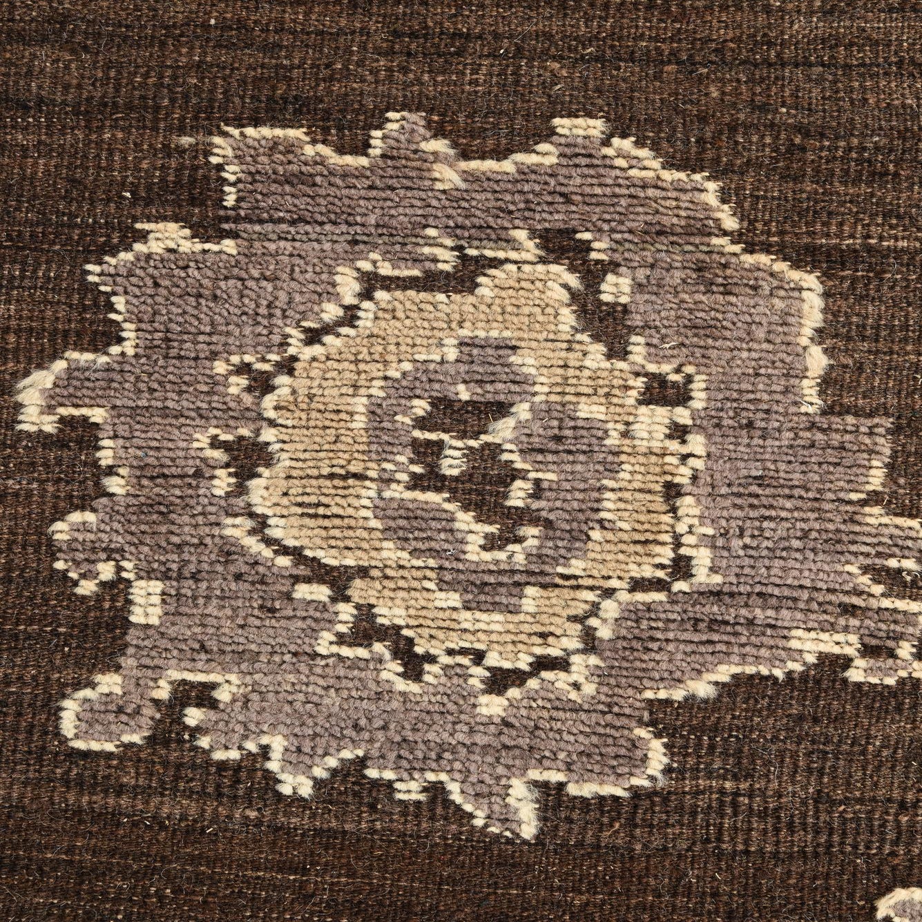 This 8x10 Oushak collection rug features a hand-knotted design made of 100% wool, ensuring a plush texture and a durable weave that can withstand high-traffic areas. The piece presents a dark brown background accented with a traditional pattern showcasing a blend of ivory, yellow, gray, and varying shades of brown, which come together to create a harmonious and sophisticated color palette.