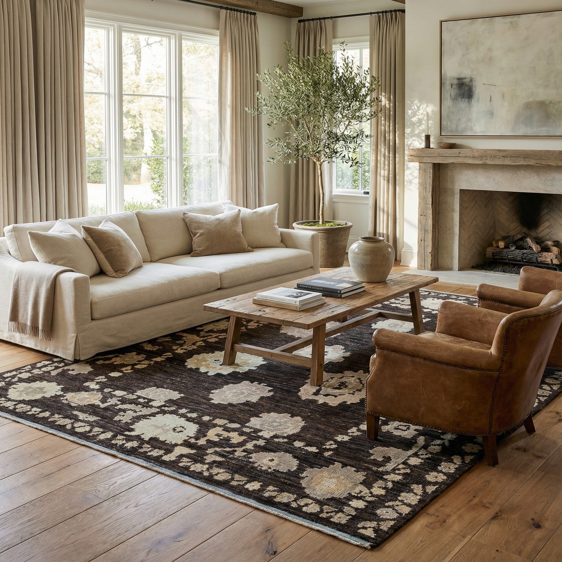 A rectangular 8x10 Rugs.com Oushak area rug in brown and tan, featuring a modern floral pattern with a border, ideal for a living room.
