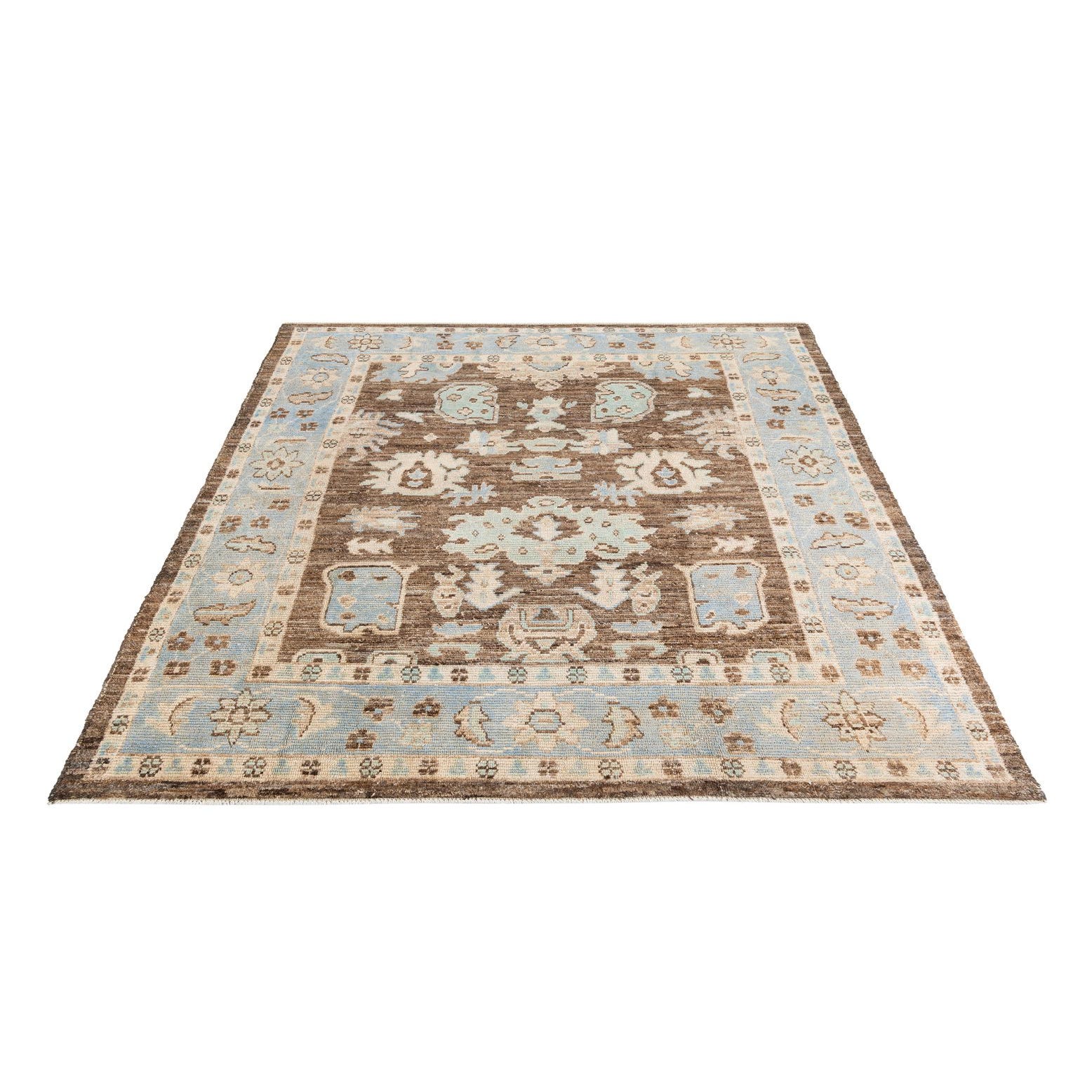 A rectangular 8x10 Oushak rug featuring a modern medallion pattern in shades of brown, tan, and light blue, suitable for a living room.
