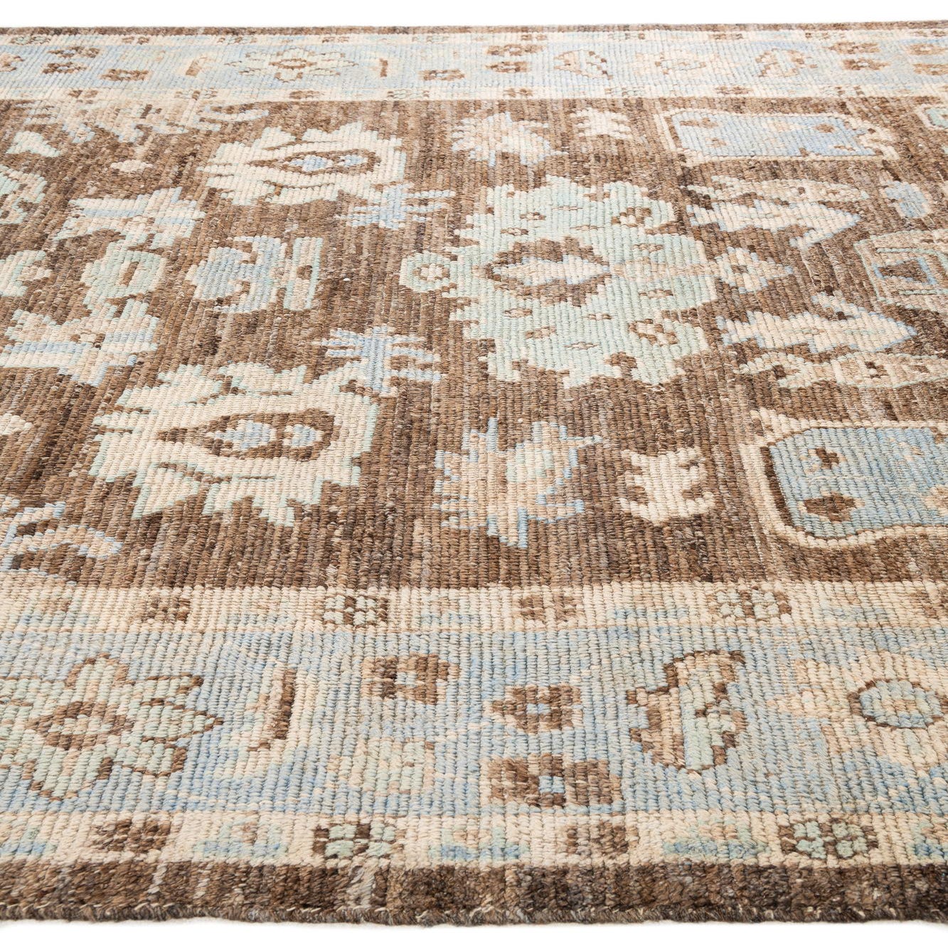 Primary color is Dark Brown. Colors in this rug include: Dark Brown, Blue, Ivory, Tan, Green.