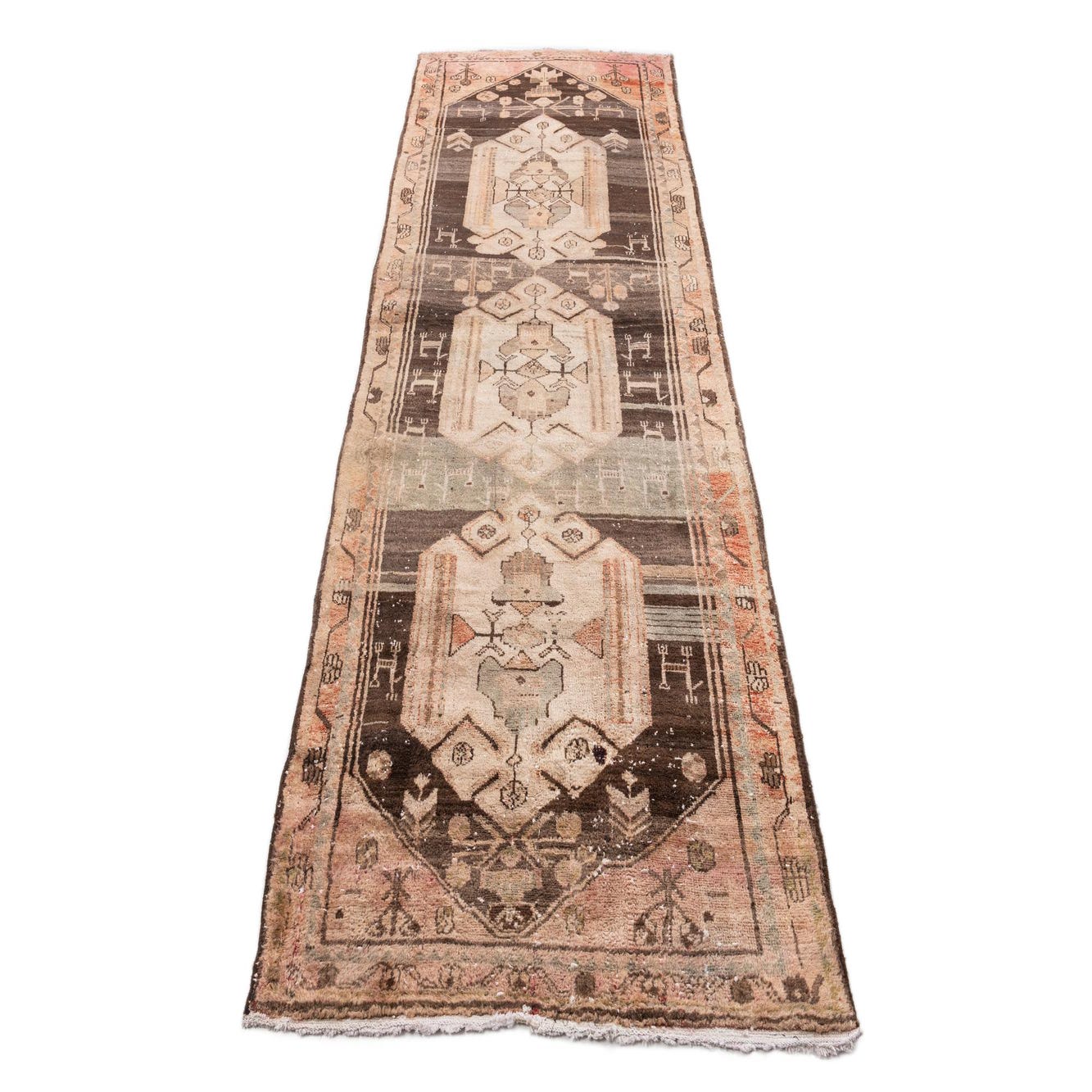 The Ultra Vintage collection presents this hand-knotted 100% wool 9 Ft Runner, offering a harmonious blend of tradition and time-honored craftsmanship. The rug showcases an intricate array of geometric and traditional motifs set against a dark brown background, complemented by hues of brown, rust red, and ivory. The central medallion and symmetrical designs are both classic and captivating, delivering visual interest without overwhelming.
