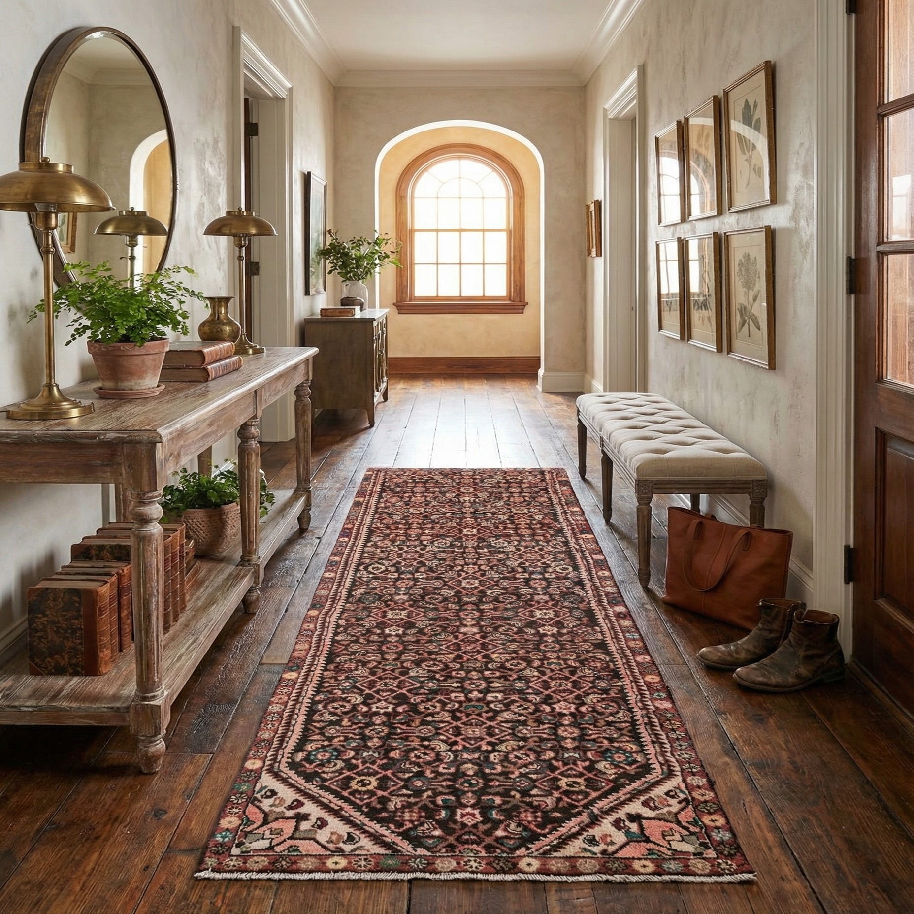 A 9 ft runner rug in shades of brown and tan, featuring a detailed Persian-style floral and geometric pattern.