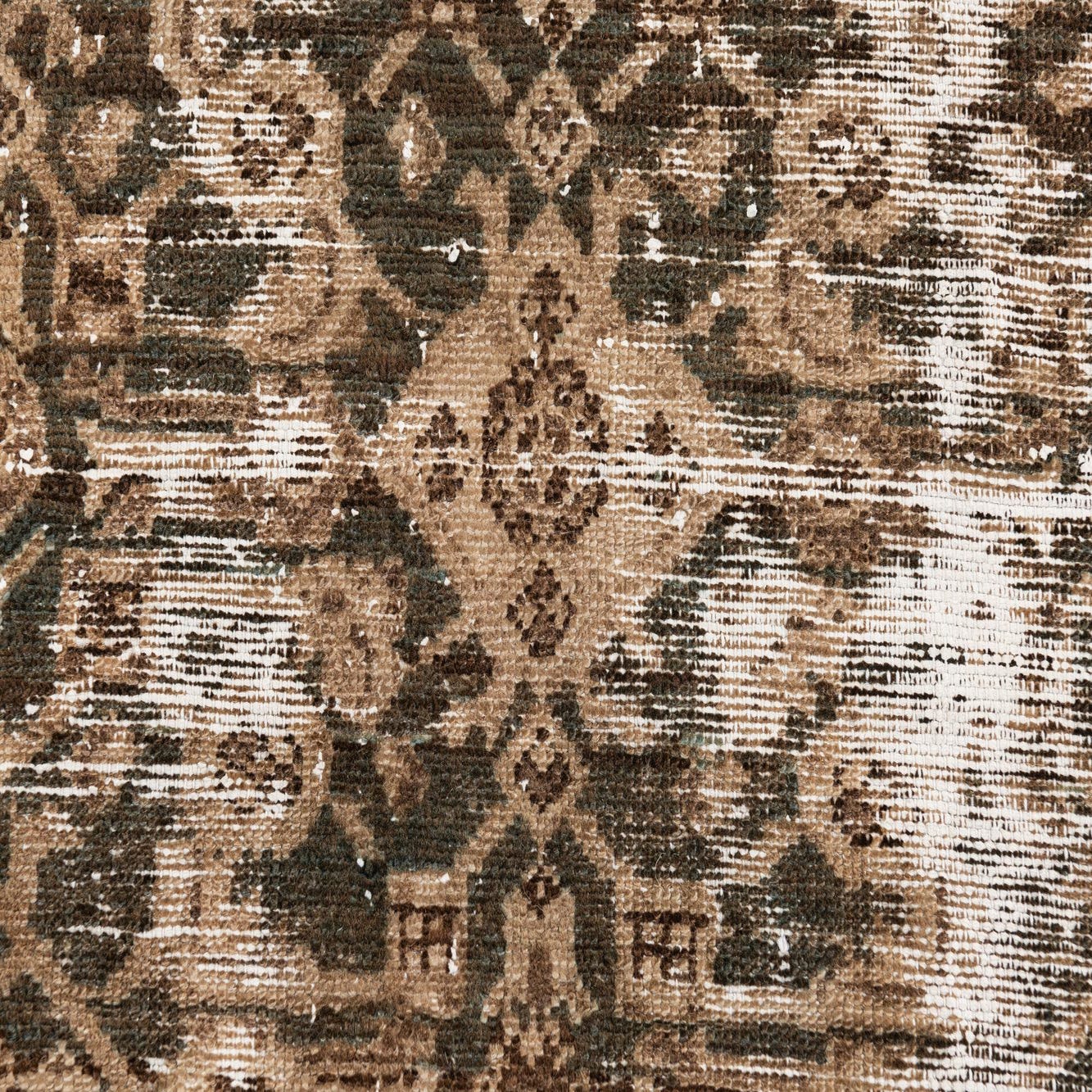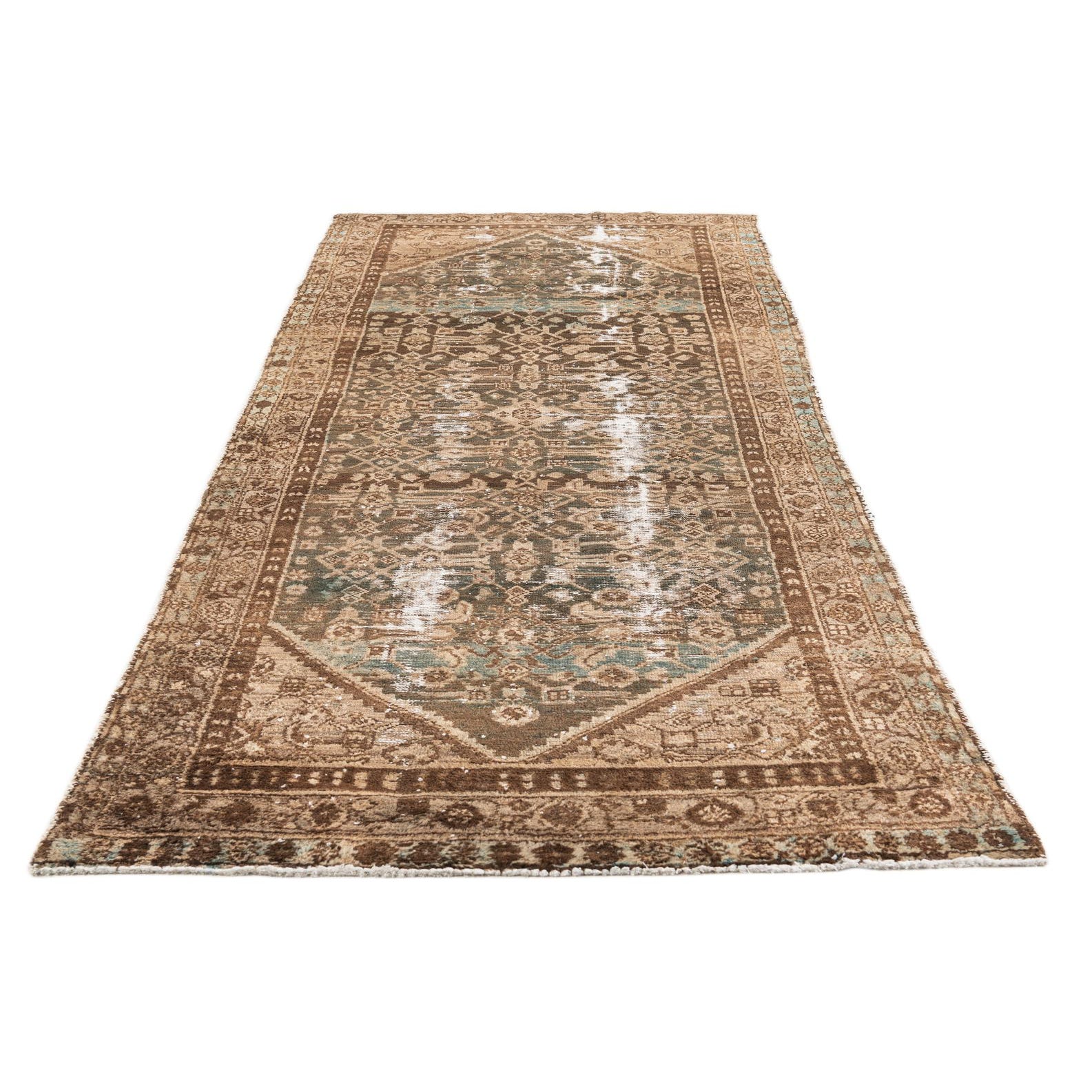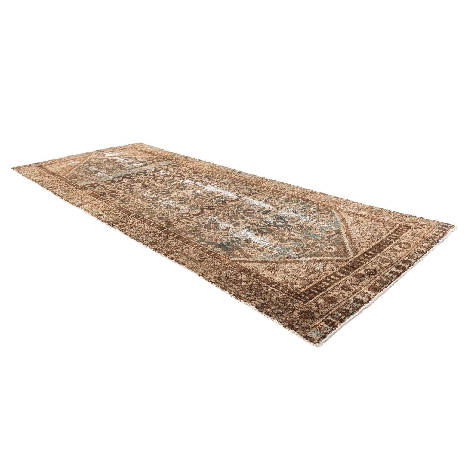 A 9 ft runner rug with a faded Persian medallion pattern in shades of brown, tan, and hints of teal.