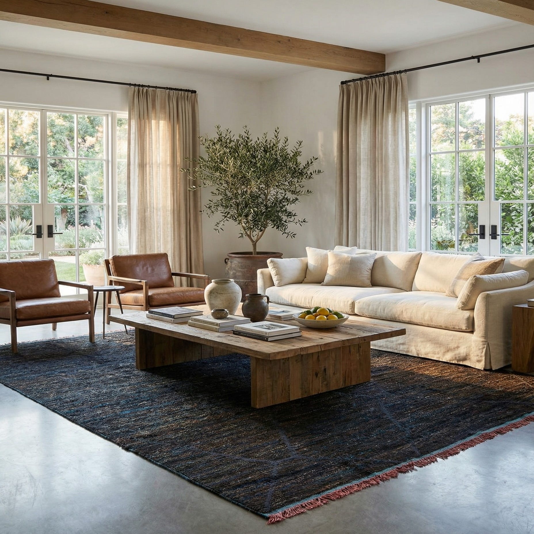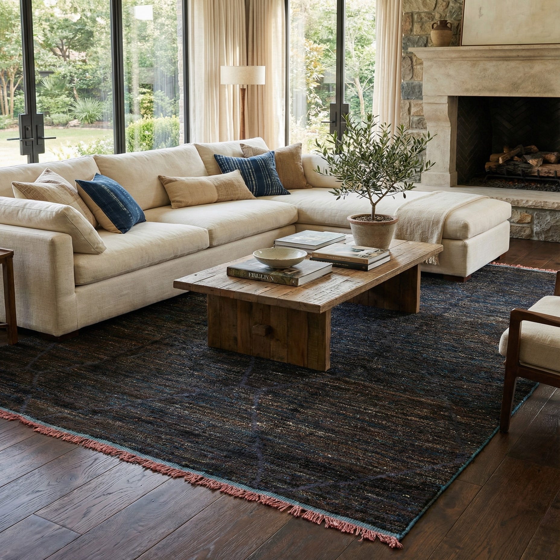 The rich, grounded palette makes this rug well suited to a range of interiors: place it under a sofa and coffee table to anchor a living room with leather seating and warm wood tones, or use it beneath a dining table in a contemporary farmhouse or industrial loft. It also pairs nicely with mid?century modern furnishings and neutral bedroom textiles, where the blue and gray accents can connect to metal or textile details for a cohesive, layered look.
