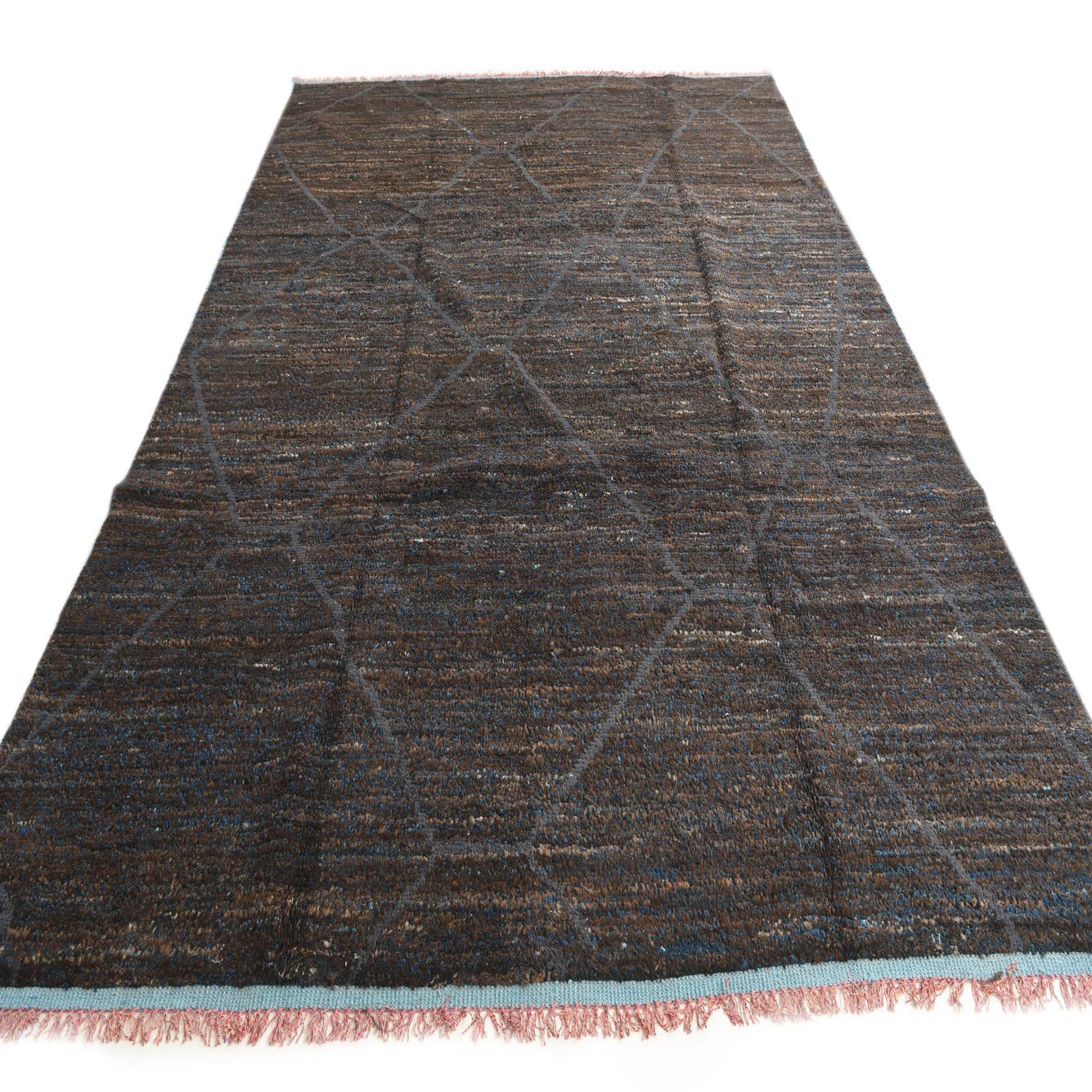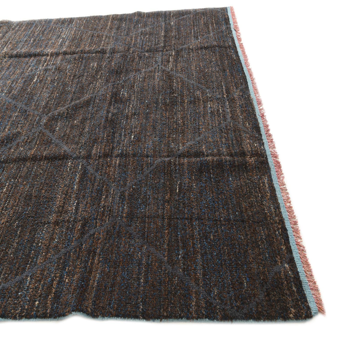 Hand-knotted from 100% wool, this rug presents a deep dark brown field punctuated by a large-scale geometric lattice in muted blue-gray. Variegated yarns of blue, gray and warm brown are woven through the pile, creating a subtly striated surface that catches light and adds visual depth. The low, dense wool pile feels substantial and softly textured underfoot, with the hand-knotted construction giving the surface a tactile, slightly rustic quality.