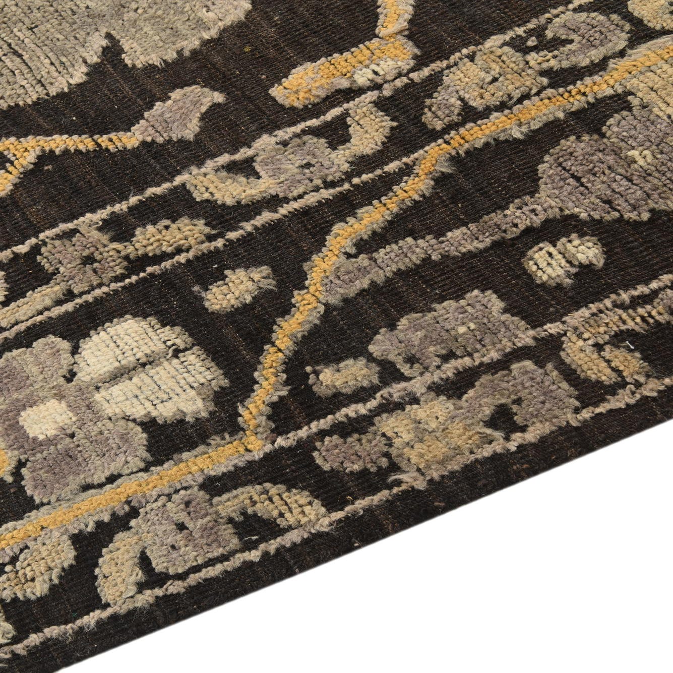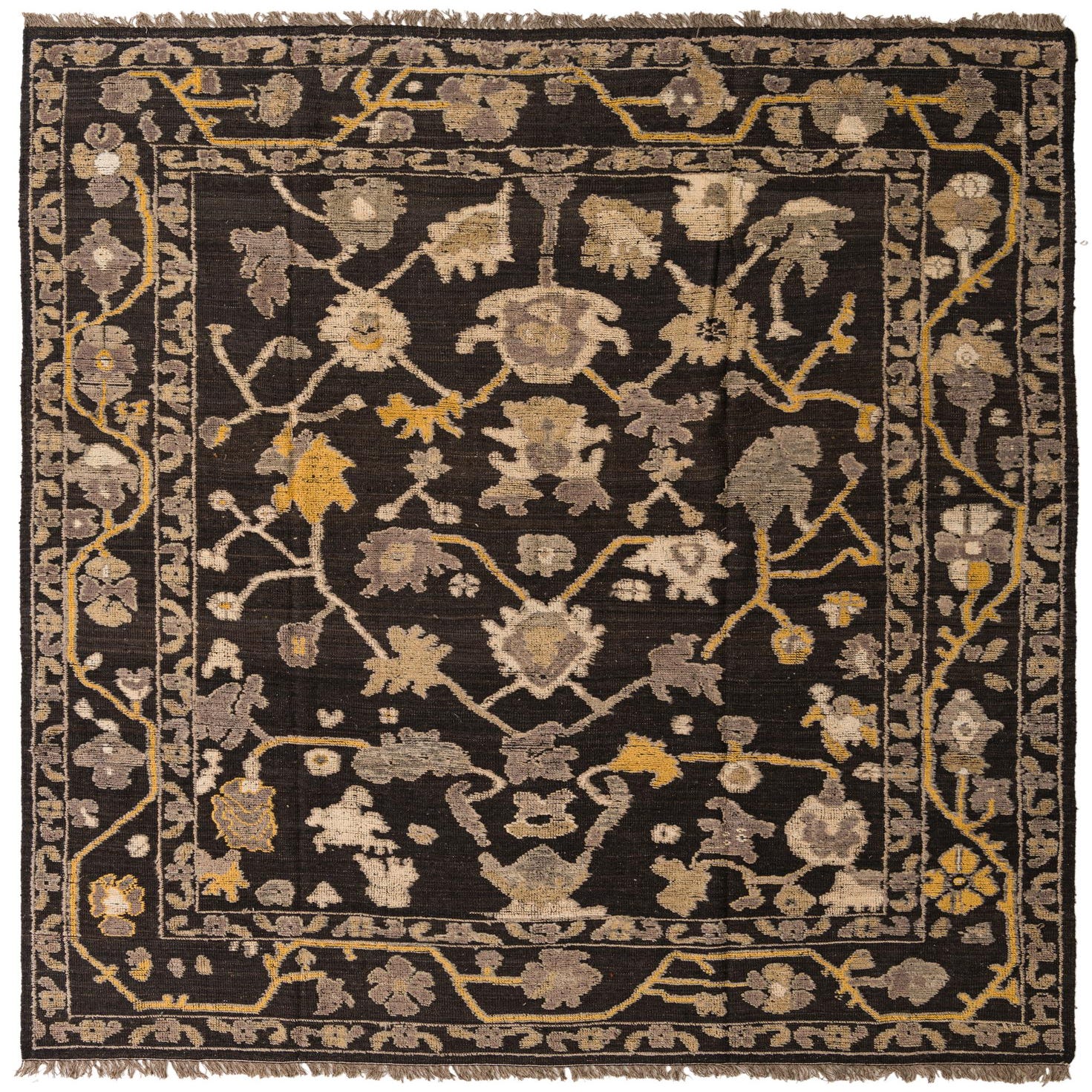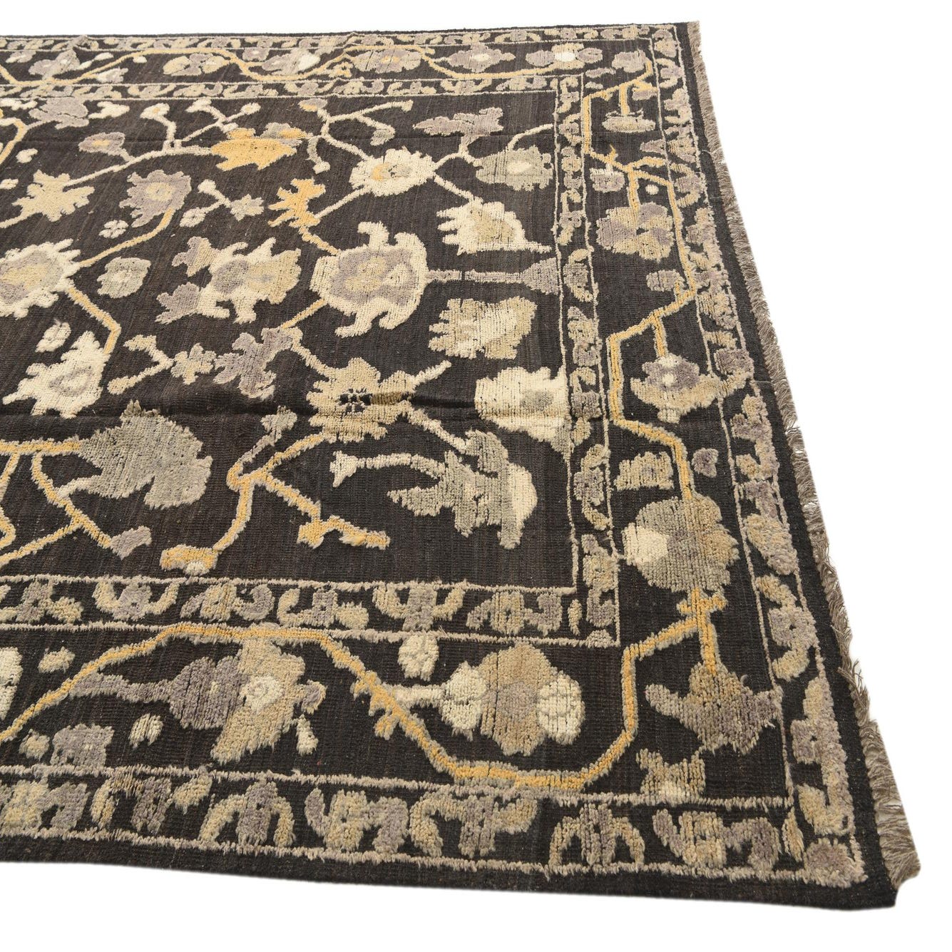 A 9x12 rectangular Oushak rug with a dark brown background and a modern floral pattern in tan, grey, and golden yellow.