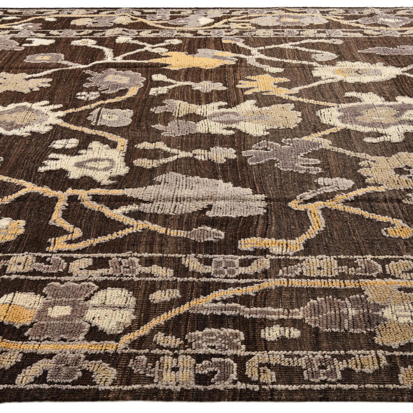 This Oushak collection rug is hand-knotted with 100% wool, providing a dense and plush feel underfoot. Measuring 9x12, this rug boasts a dark brown background that anchors its elegant design, while its palette of gray, ivory, and yellow highlights create a quietly sophisticated pattern. Traditional motifs accented by a unique yellow border give this piece a sense of timeless heritage with a contemporary twist.