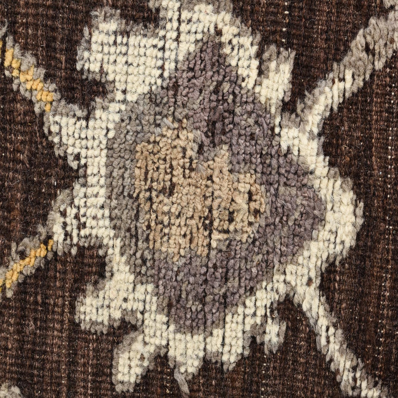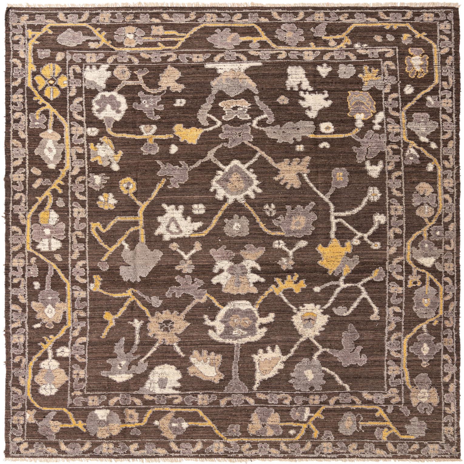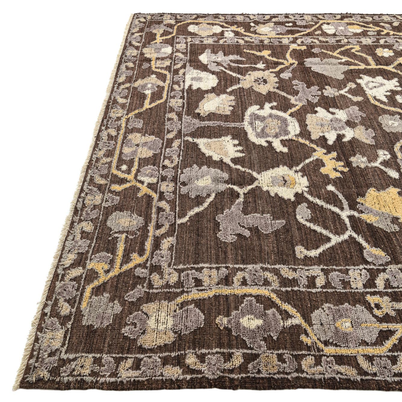 This Oushak collection rug offers a distinguished palette of dark brown, gray, ivory, light brown, and yellow, set against a rich dark brown background, adding depth and sophistication to the floor space. Crafted from 100% wool and hand-knotted to perfection, this 9x12 rug presents a timeless pattern reminiscent of classic Oushak designs. Light ornamental motifs adorn the field, while a complementary border frames the composition, all rendered with an artisan's precision.