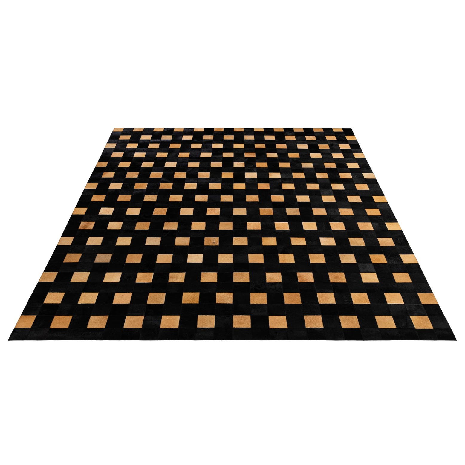 A rectangular 8x10 dark brown and beige cowhide rug with a modern checkered patchwork pattern, suitable for a living room.