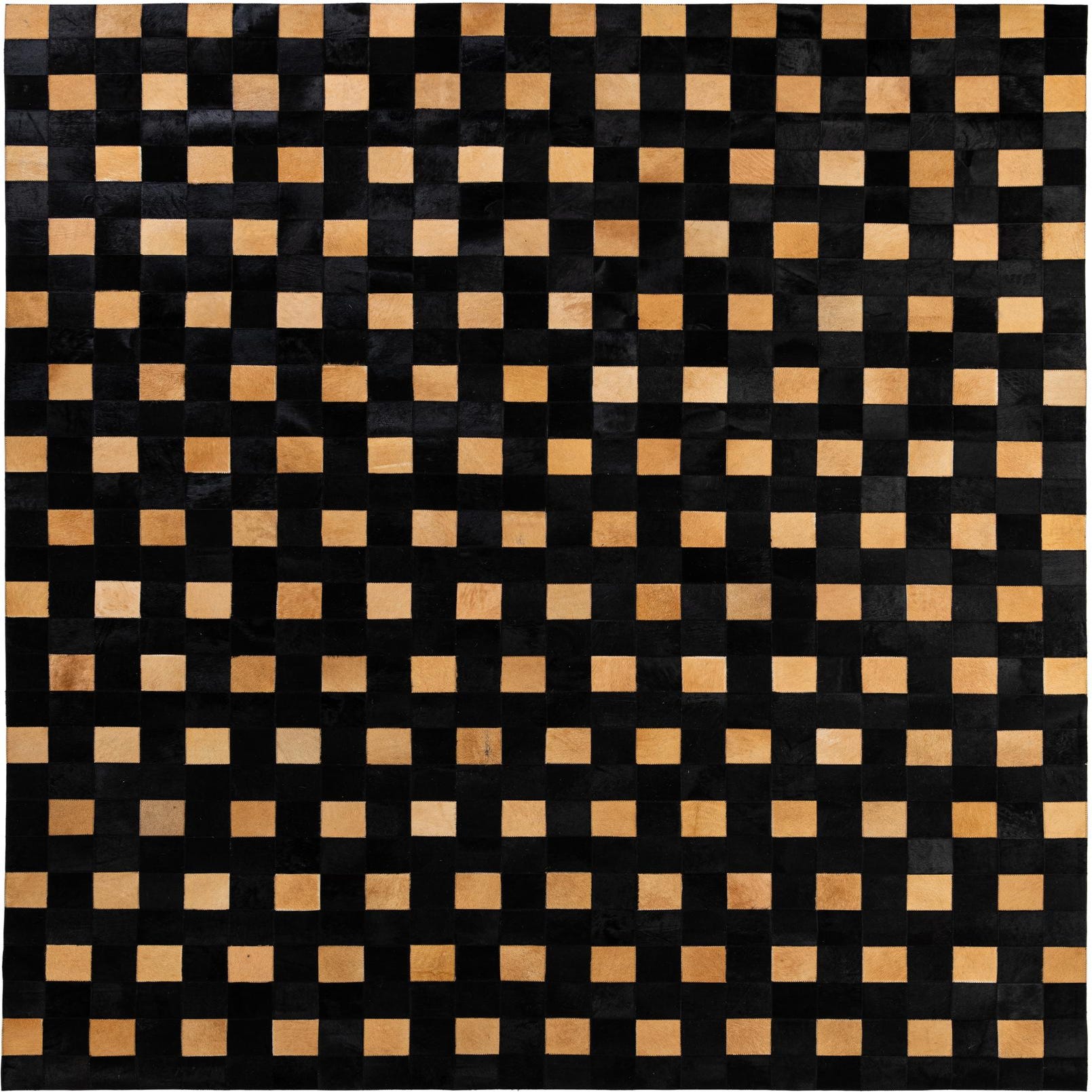 A compact checkerboard of dark brown and beige squares creates a clean, modern geometric statement. The patchwork layout is rhythmic and precise, with each small square framed by visible stitching that adds gentle texture across the surface. Handmade of cowhide and leather, the rug has the low, smooth pile and slight nap variation typical of hair-on-hide—tactile where the seams meet and softly reflective where the beige hides catch the light.