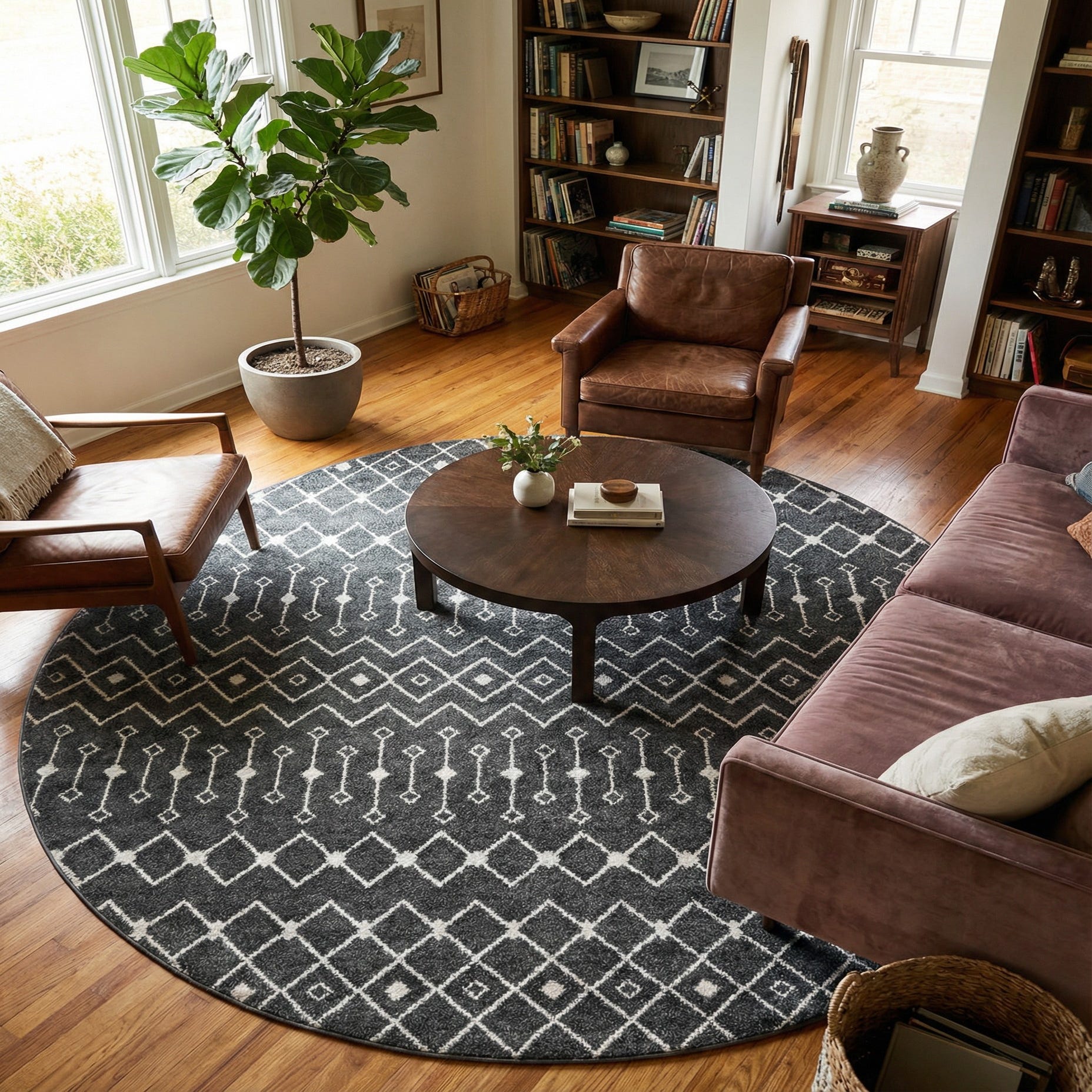 With a versatile design, this rug is apt for a range of interior styles, from modern minimalist to more eclectic spaces. It can anchor a seating area, add definition to an open-concept space, or create a focal point in a simplistic setting. The rug's round shape offers a unique opportunity to soften the hard lines typically found in furniture and room layouts, making it ideal for those looking to add an element of softness to their décor.