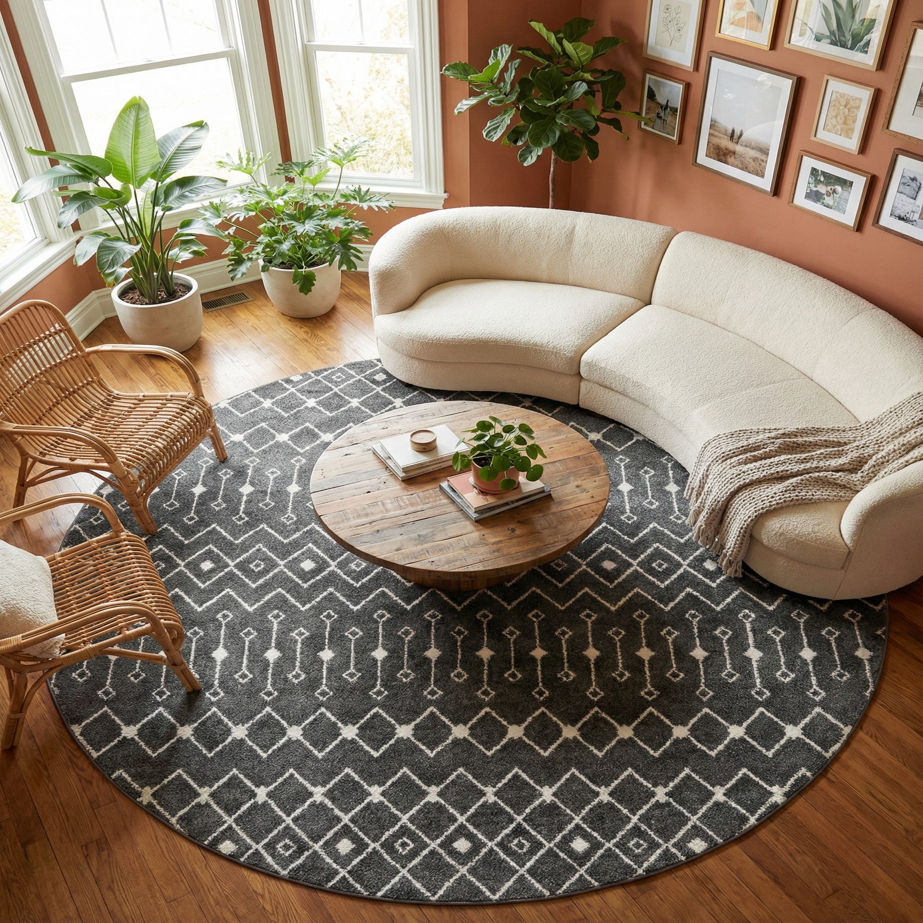 The Moroccan Trellis Collection offers this 10 Ft Round rug, machine-woven of polypropylene, presenting a harmonious blend of dark gray and ivory hues. The design features a dynamic trellis pattern that provides both visual interest and contemporary flair. The dark gray background ensures that the geometric motifs stand out, offering a sophisticated contrast.
