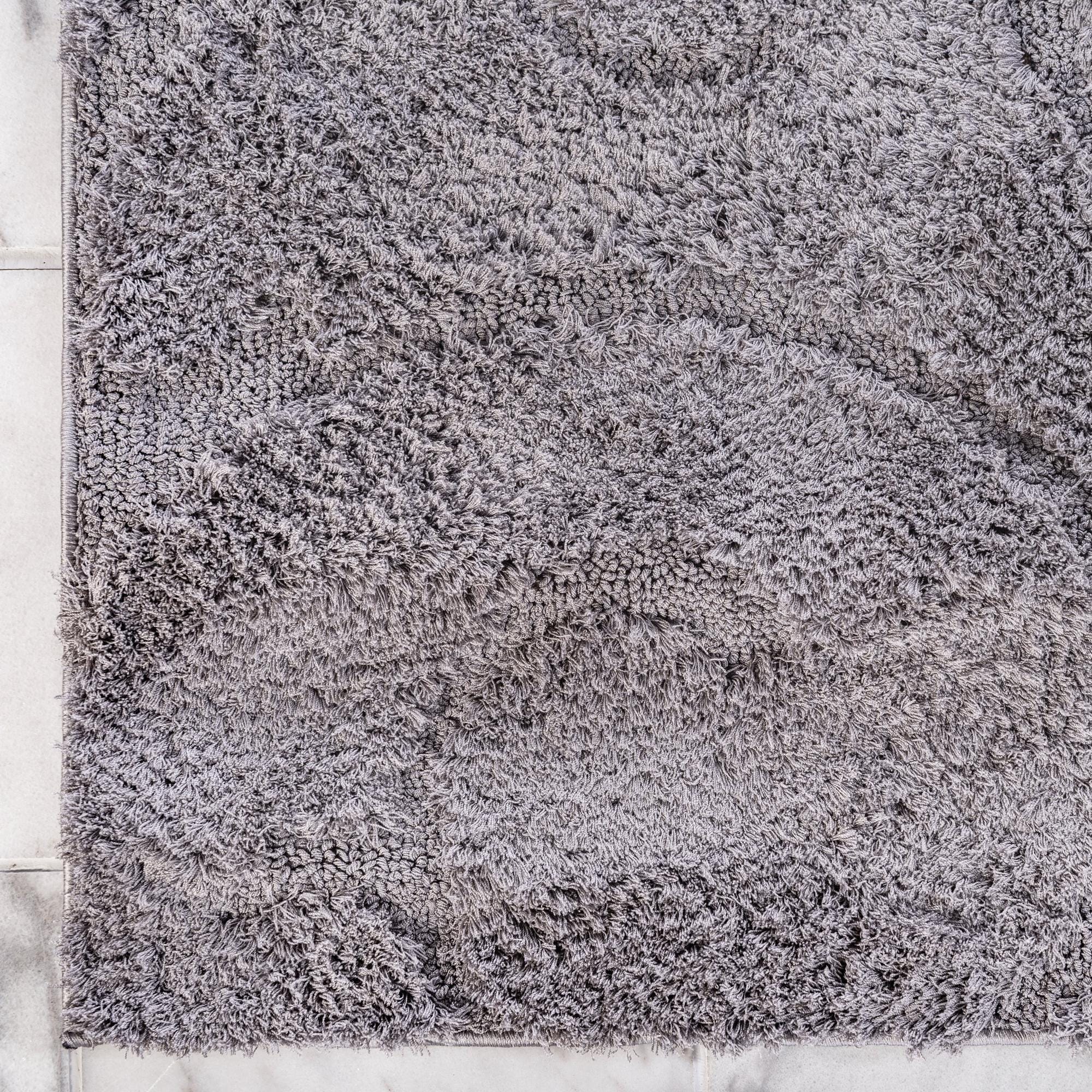 A tone-on-tone dark gray runner with a botanical scroll motif, this shag rug uses subtle pile variation to define curling leaves and vines across its surface. The pattern is sculpted rather than printed, so the raised swirls create a gentle relief that catches light and adds depth without introducing additional colors. Machine made from 100% polyester, the construction gives the pile a plush, slightly lofty feel that cushions footsteps while retaining a defined surface pattern.