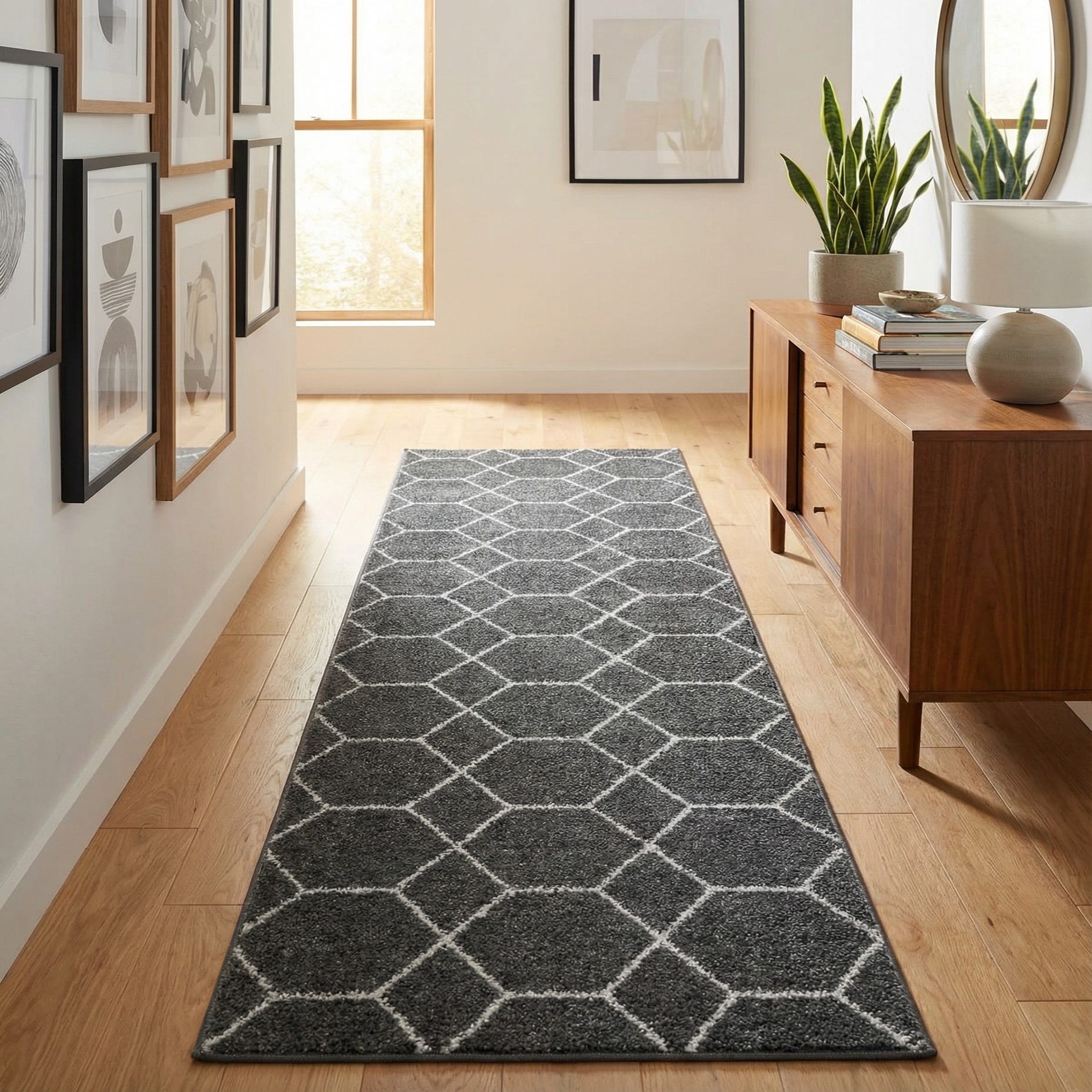 A bold hexagonal lattice in ivory traces a regular honeycomb across a deep dark gray field, giving this runner a clean, modern geometric look. The contrast between the ivory lines and the dark gray background defines the pattern without additional ornament, creating a simple, graphic statement that fits contemporary and transitional schemes alike.