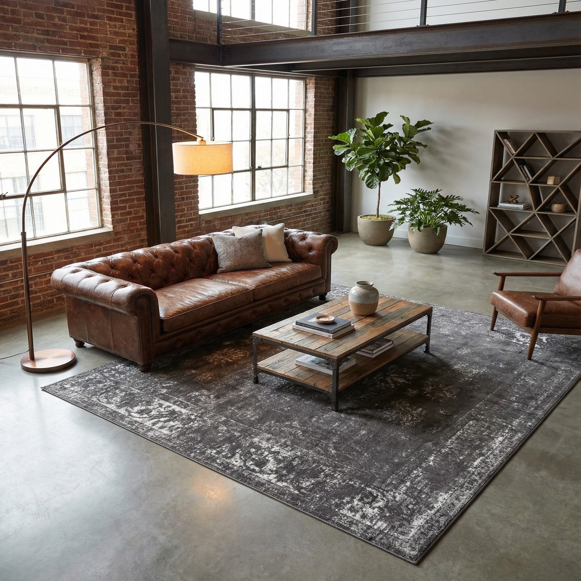 This rug works well in contemporary, transitional, or industrial interiors. Place it beneath a living room seating group to anchor neutral sofas, layer it under a bed to add quiet contrast to light linens, or use it in a home office for a refined yet relaxed feel. The muted dark gray and beige palette pairs easily with warm wood tones, matte metal finishes, and minimalist furnishings, making it a versatile choice for high-traffic areas where style and practicality both matter.