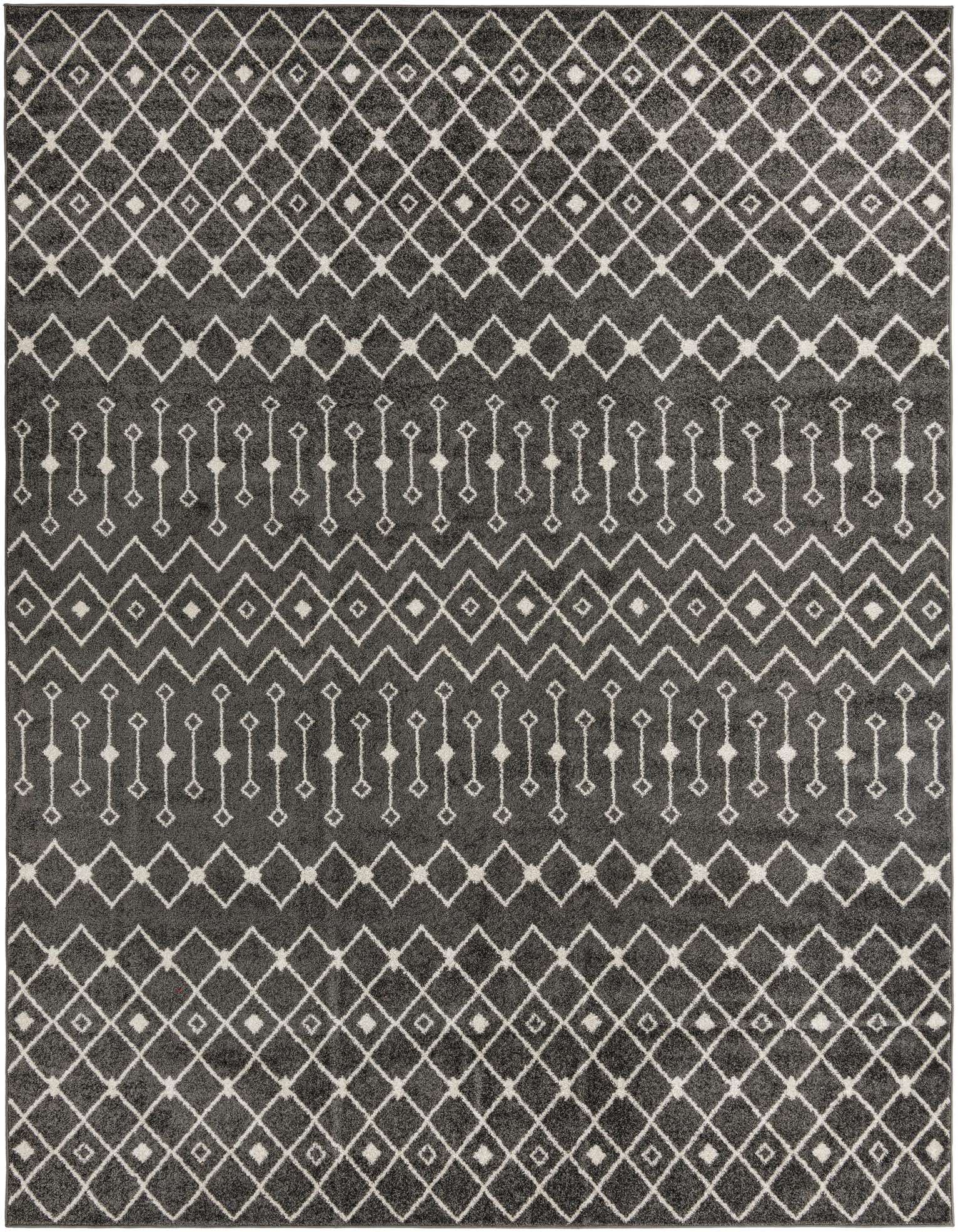 The Moroccan Trellis Collection offers a timeless geometric pattern enriched with a modern color palette of dark gray and ivory. This 10x13 area rug showcases a sharp trellis design, an embodiment of contemporary sophistication balanced with traditional motifs.