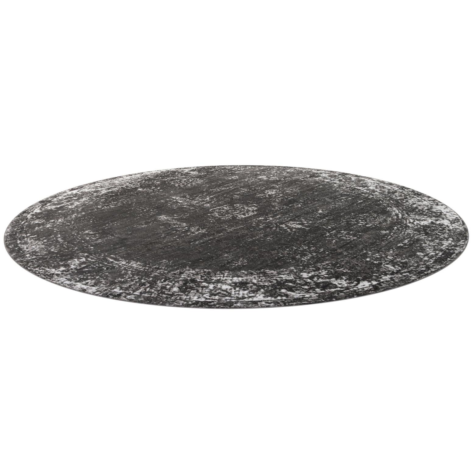 A dark gray ground anchors this round rug, softened by scattered beige highlights that form a gently distressed medallion and worn border. The pattern reads as a lived-in, vintage-inspired design with subtle ornamental marks emerging from the background rather than bold motifs. Running your hand over the surface reveals a low-pile, slightly velvety texture where the distressed accents add a faint variation in pile height and visual depth.