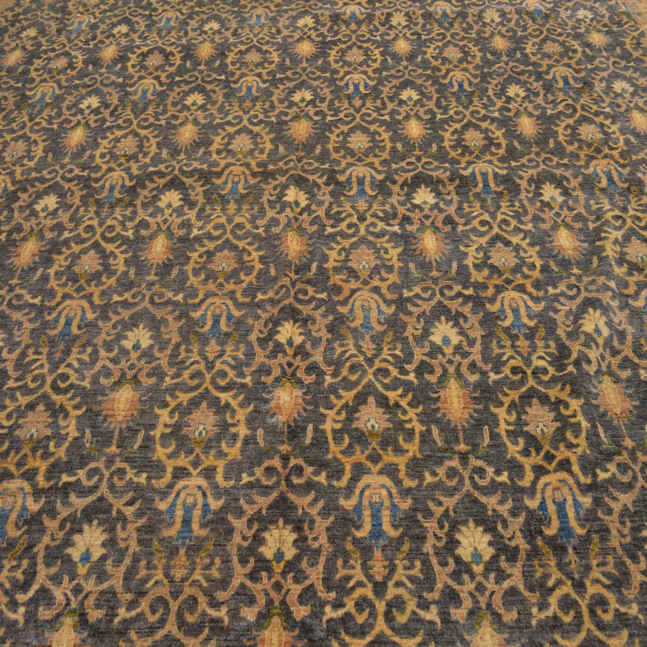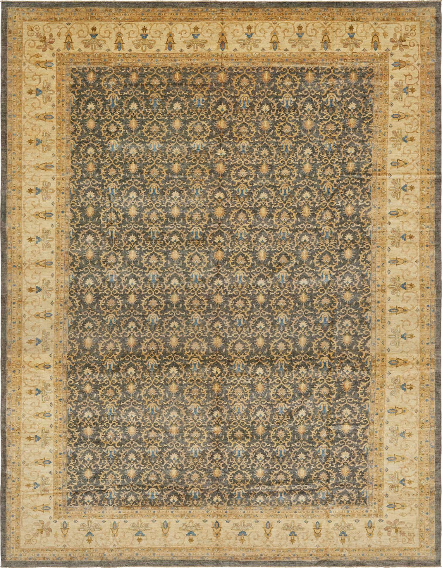 The Peshawar Ziegler collection presents a hand-knotted rug crafted from 100% hand-spun wool, offering a texture that is both appealing to the touch and visually compelling. This 13x18 rug features a dark gray background embellished with an intricate pattern that integrates colors such as beige, cream, light brown, tan, and teal. The detailed design evokes a sense of sophistication and tradition, suited to a variety of decor styles.