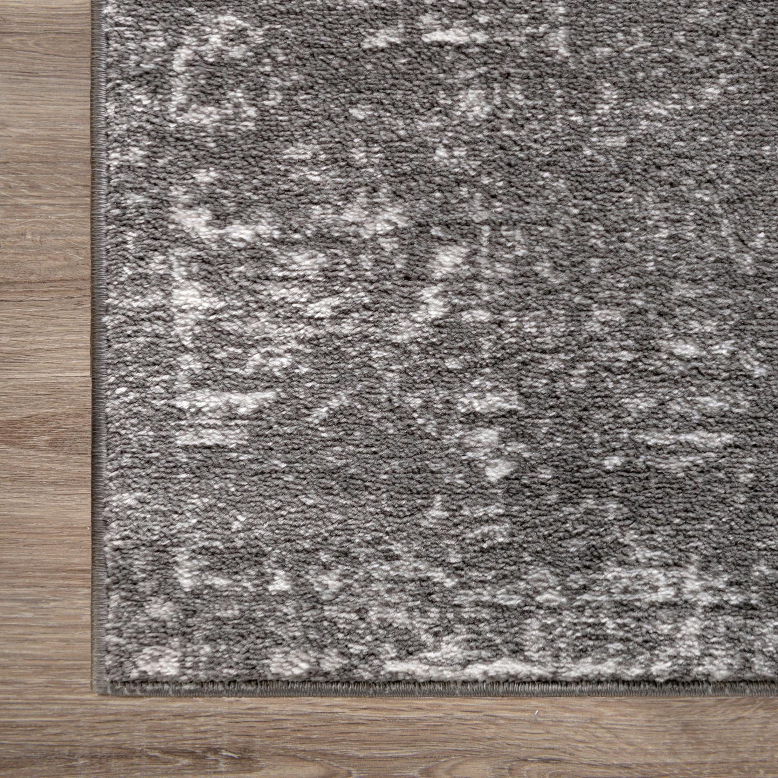 A low-contrast, distressed pattern unfolds across a dark gray field with soft beige highlights. Faint, repeating medallion impressions and scattered lighter areas create a worn, lived-in effect that adds depth without calling attention to itself. Machine-made from 100% polypropylene, the rug has a low-profile pile with a soft, slightly velvety hand and a subtle sheen where the fibers catch the light.