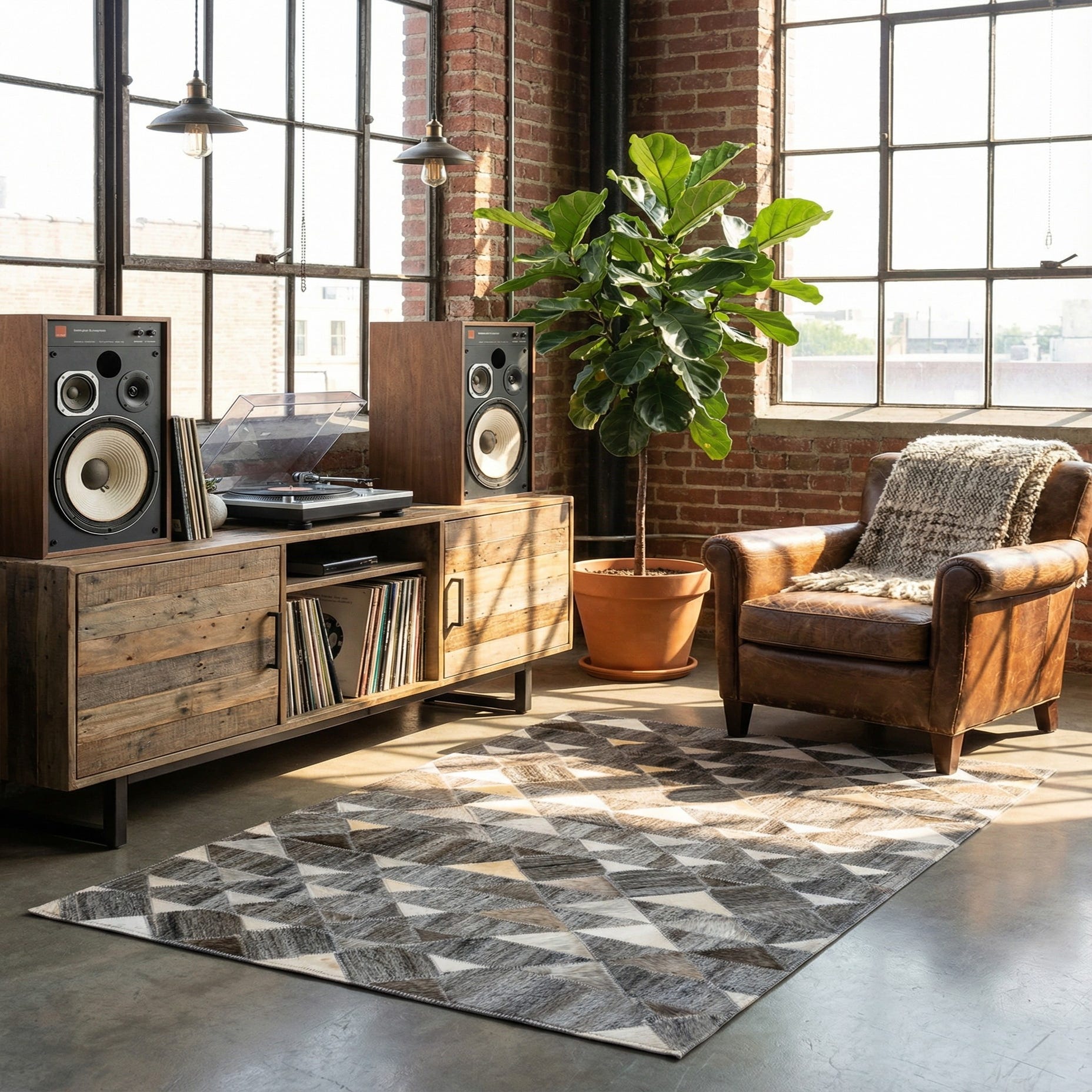 A 2x3 rectangular modern area rug featuring a geometric pattern of gray, silver, and cream cowhide and leather triangles.
