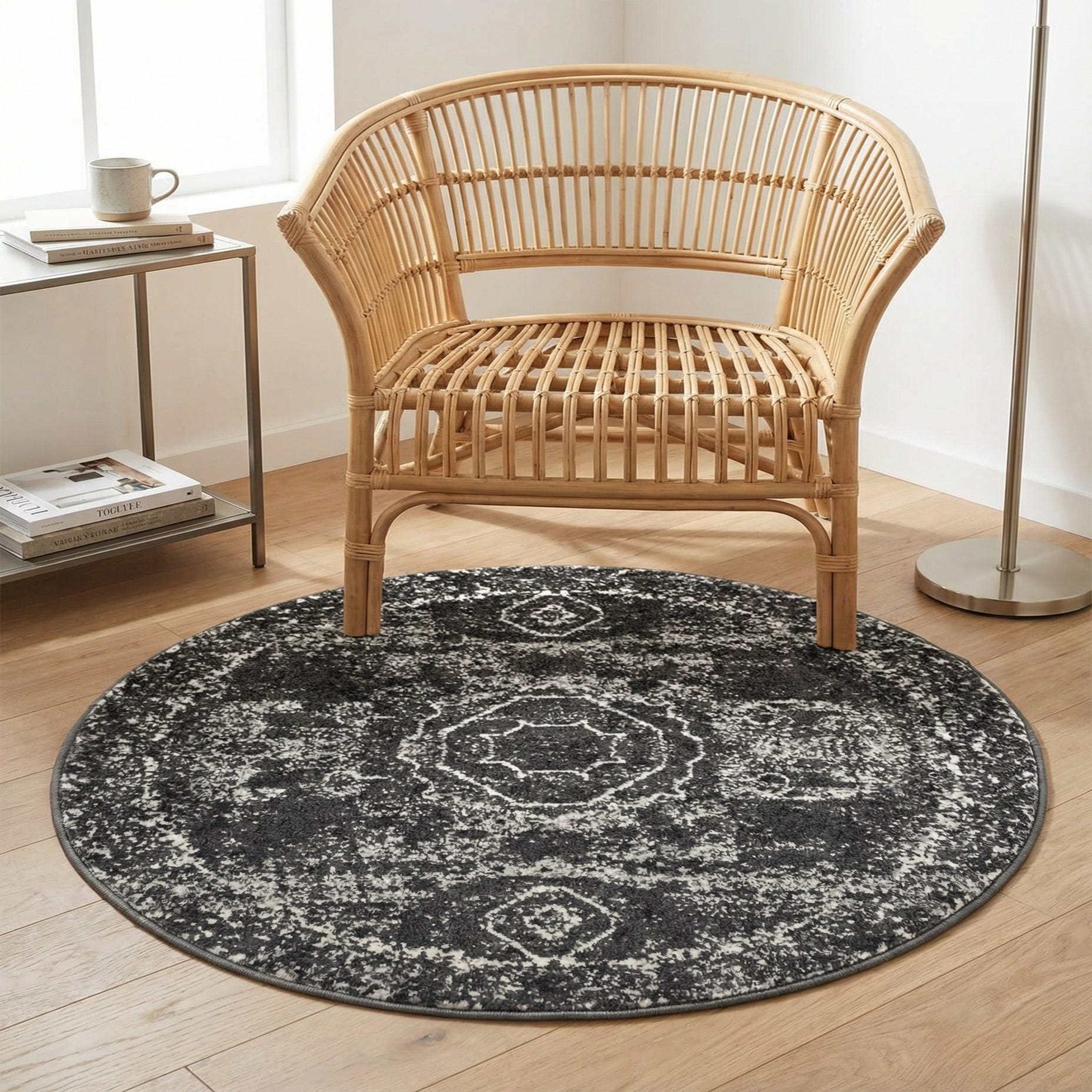 A round area rug with a vintage-inspired, distressed medallion motif set against a dark gray background. Subtle gray and ivory accents trace the central medallion and surrounding border, creating a softly weathered look that adds visual depth without bold contrast. Machine-made of 100% polypropylene, the low-profile pile has a soft hand and a slightly textured surface that’s smooth underfoot while still showing the pattern’s faded detailing.