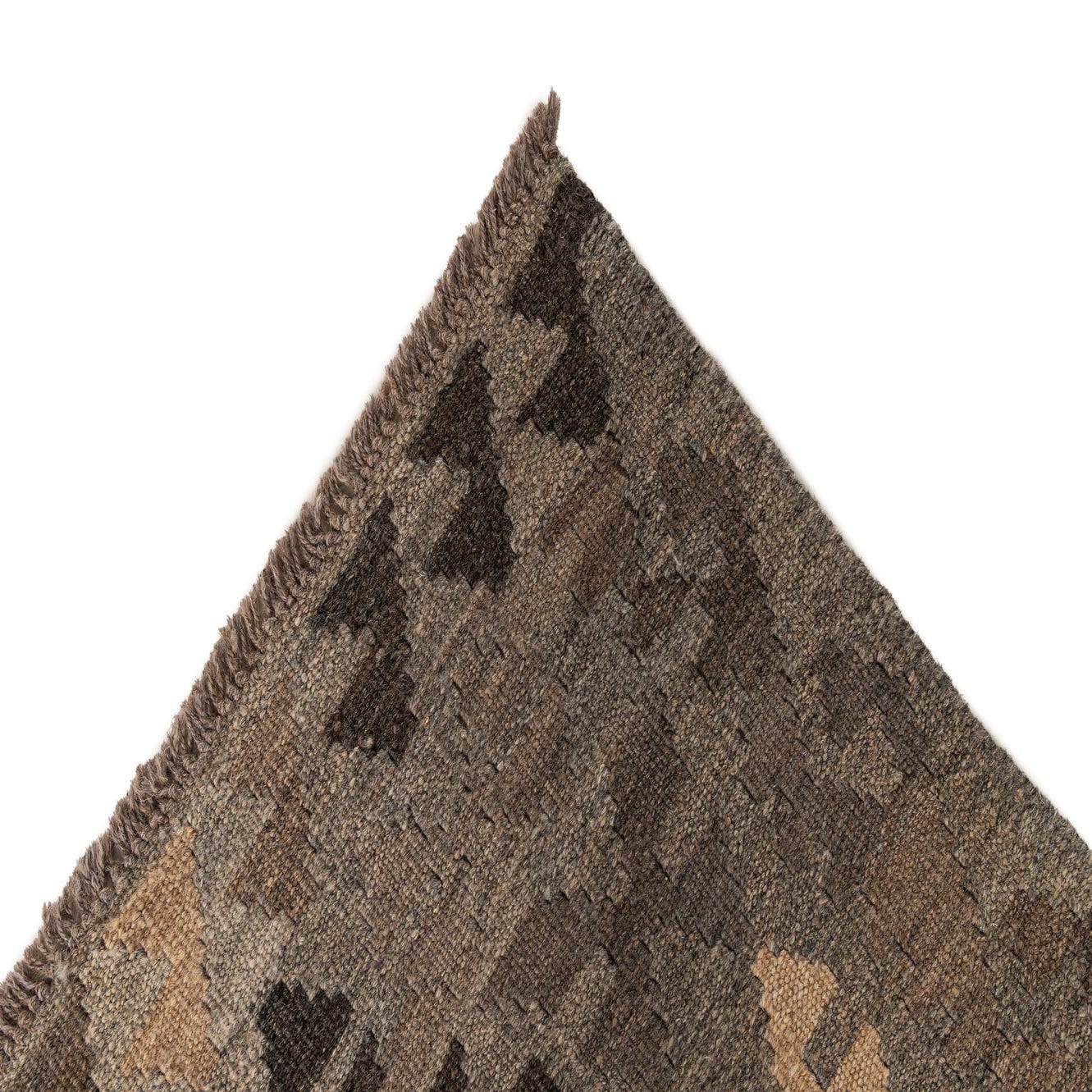 A 3x5 rectangular Kilim Maymana rug featuring a tribal geometric pattern in varying shades of gray and brown.