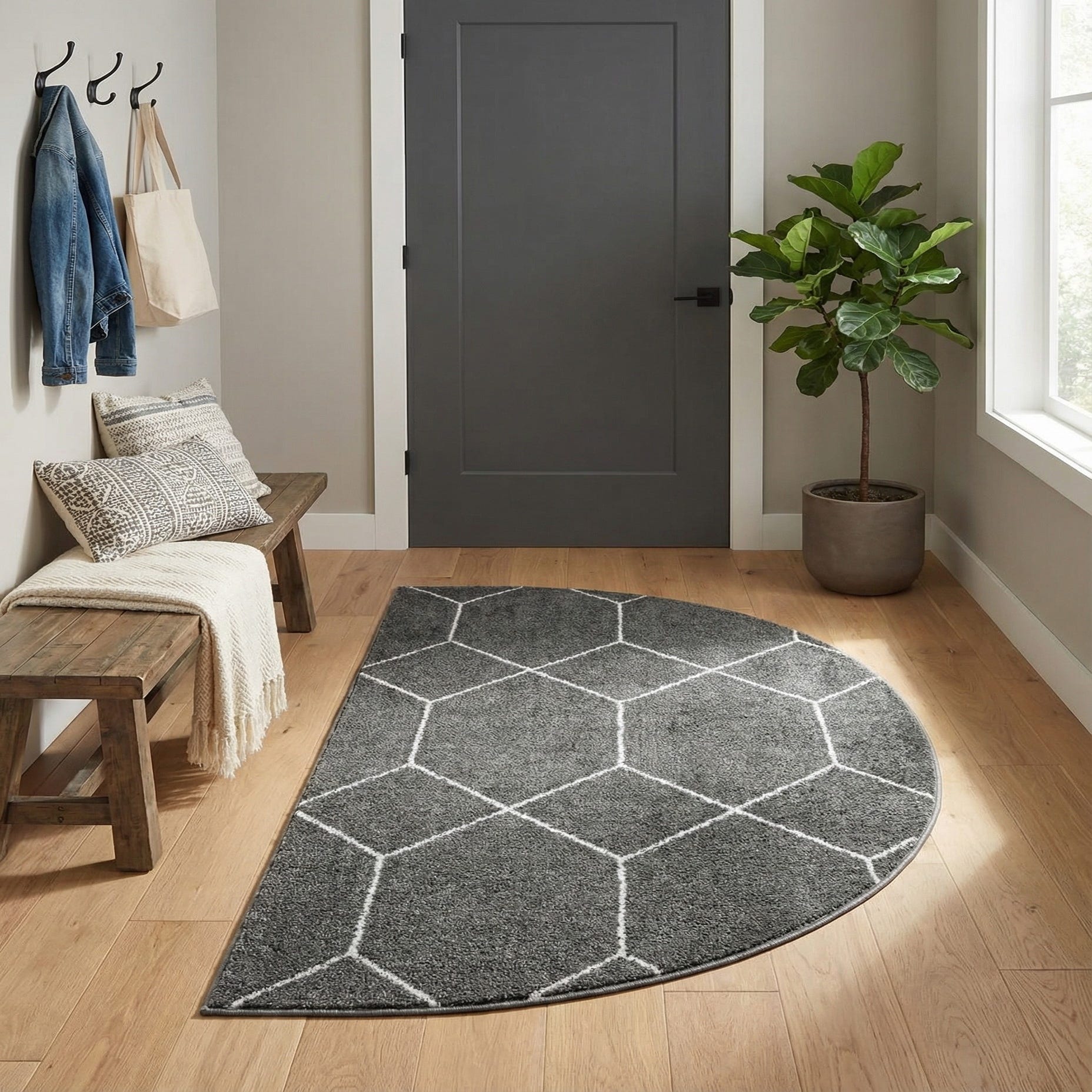 A 3'0 x 6'0 hearth-shaped gray rug with a white contemporary trellis pattern, suitable for indoor spaces.