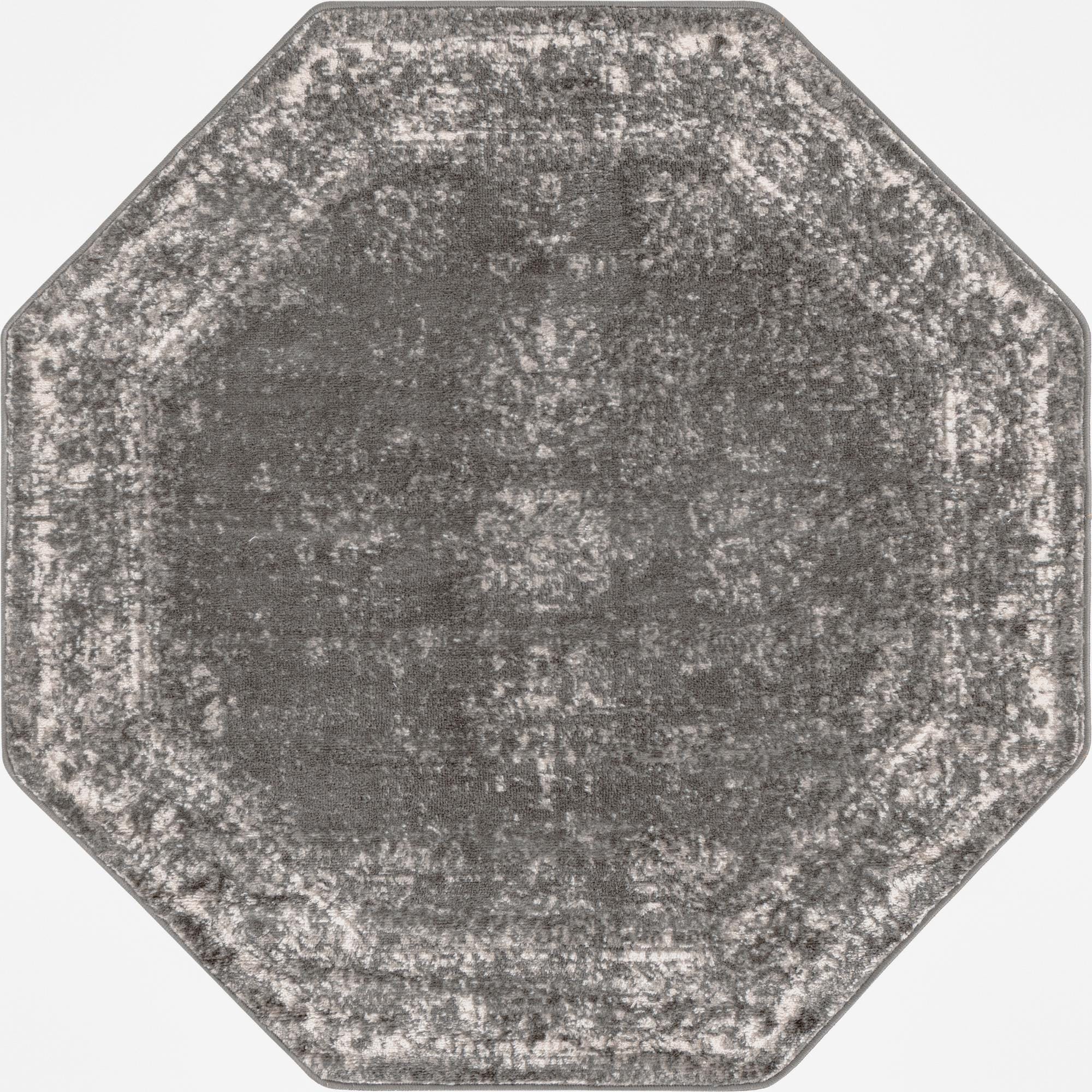 A low-contrast, distressed pattern gives this octagonal rug a quiet, lived-in look. The dark gray field provides a rich backdrop while soft beige highlights catch the light, creating a subtle, mottled effect across the surface. Machine made from 100% polypropylene, the pile has a low-to-medium height with a velvety hand and slight sheen that invites touch without overwhelming the room.